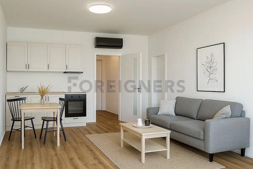 Tento světlý ateliér 2+kk (46,6 m²) s terasou 9,3 m², umístěný ve 3. podlaží novostavby Meridiem – budova A1 - prostřední nejvyšší budova, vás zaujme na první pohled.