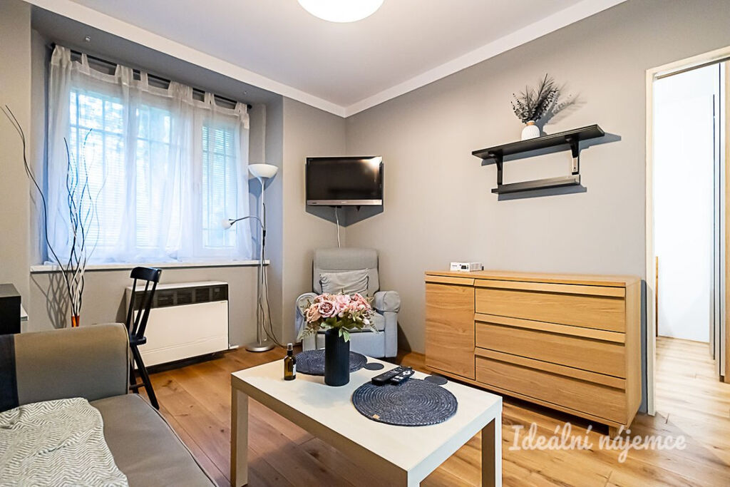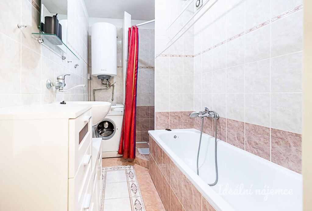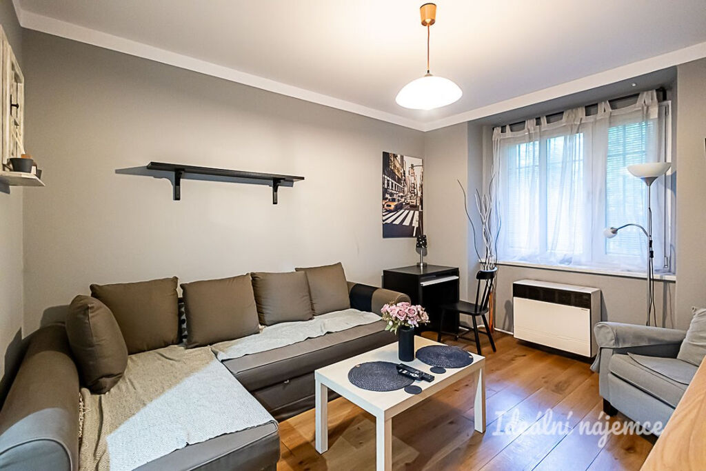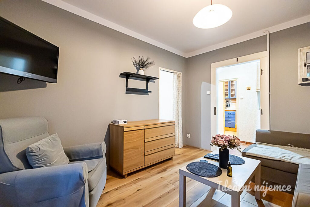 V obývacím pokoji je k dispozici pohodlná sedací souprava, konferenční stolek, televizor a úložné prostory. Samostatná ložnice nabízí dostatek klidu i prostoru pro zařízení podle vašich potřeb. Koupelna je prakticky řešena – najdete zde vanu i sprchový kout, umyvadlo, koupelnovou skříňku a pračku. Toaleta je oddělená.