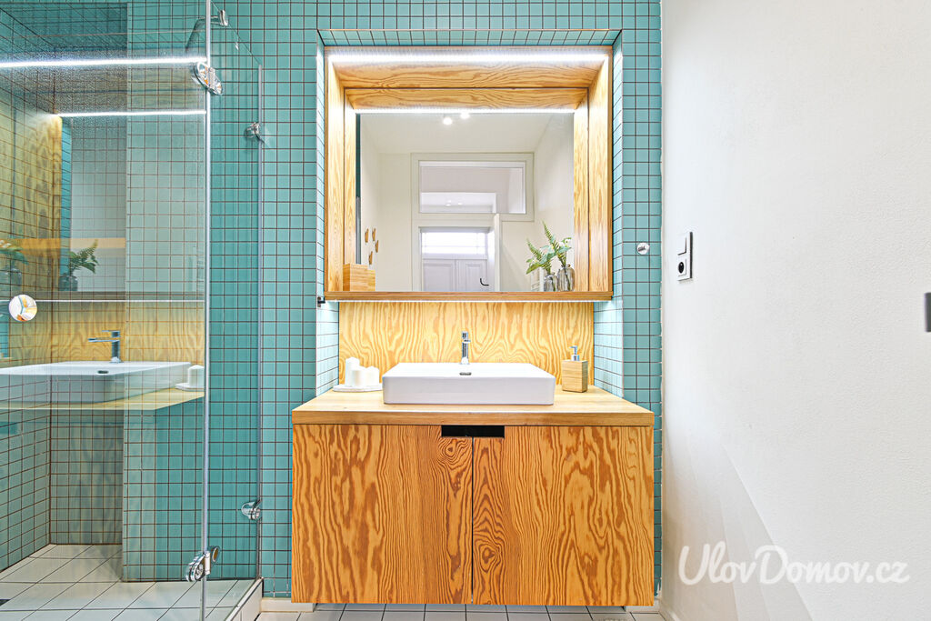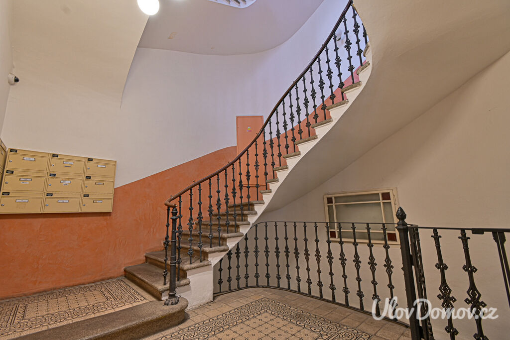 Vstup do bytu vede z historické pavlače s krásným výhledem na vodárenskou věž a řeku Vltavu.