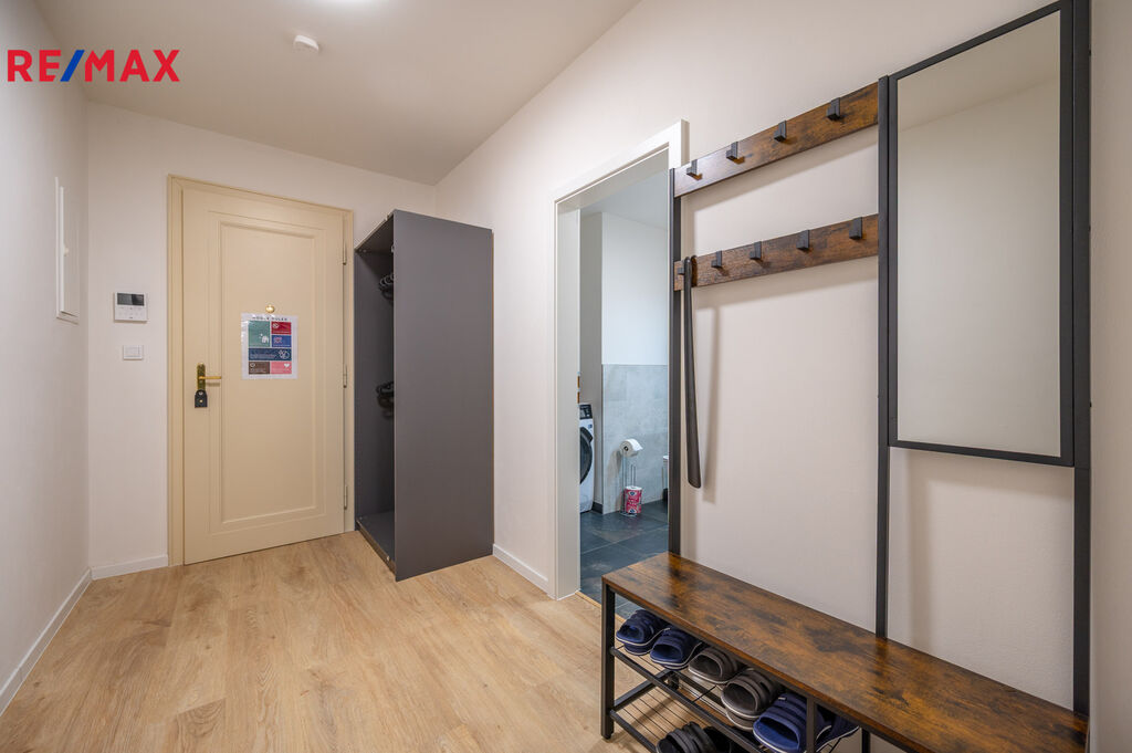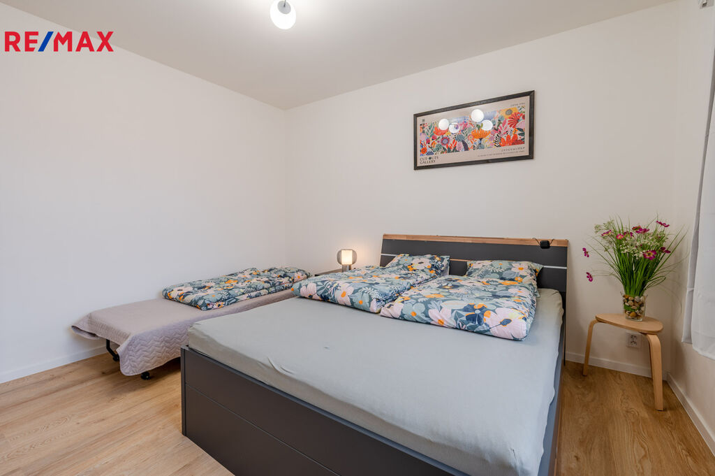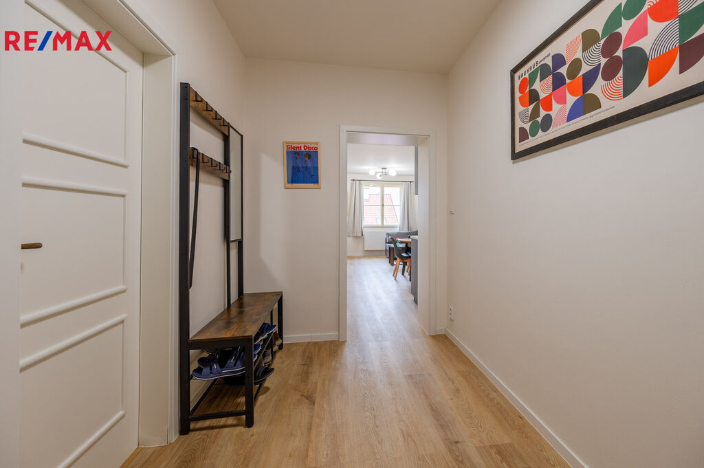 Dispozici bytu dva prostorné pokoje, kdy obývacího pokoj je propojen s moderní kuchyňskou linkou a jídelním stolem. Druhý slouží jako ložnice. Dále je zde koupelna se sprchovým koutem a toaletou, plus prostorná chodba. Na chodbě naproti vchodu do bytu je ještě malá komora.