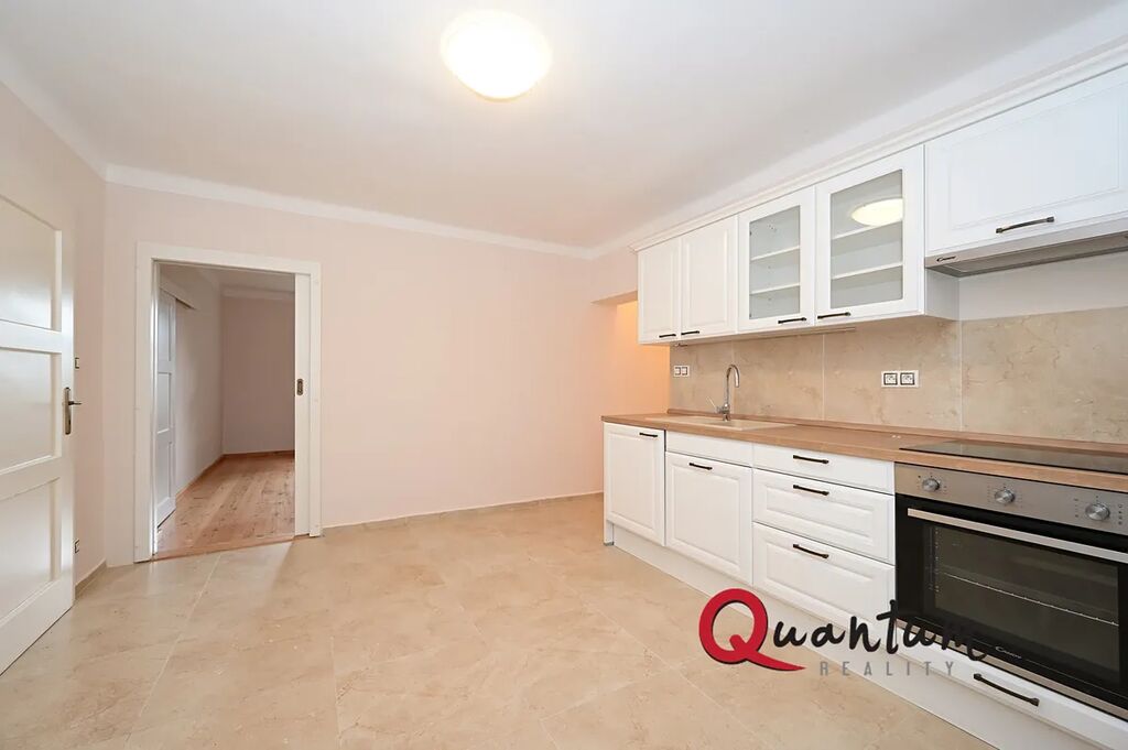 Ze zádveří je přístupná kuchyně 14,8 m2 s novou kuchyňskou linkou vybavenou sklokeramickou varnou deskou, horkovzdušnou troubou, digestoří a pračkou, lednice je samostatně. Na podlaze je praktická dlažba. Z kuchyně se vstupuje do pokoje 15,6 m2 s krásným výhledem do zahrady a do údolí, na podlaze jsou modřínová prkna. Koupelna, se sprchovým koutem, topným žebříkem a bílým koupelnovým nábytkem, je prosvětlena oknem. Toaleta s umývátkem je samostatná.