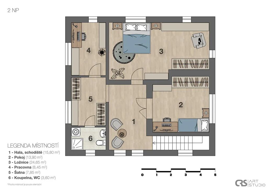 2np: Hala napojená na schodiště, pokoj, ložnice, pracovna, šatna, koupelna, wc.