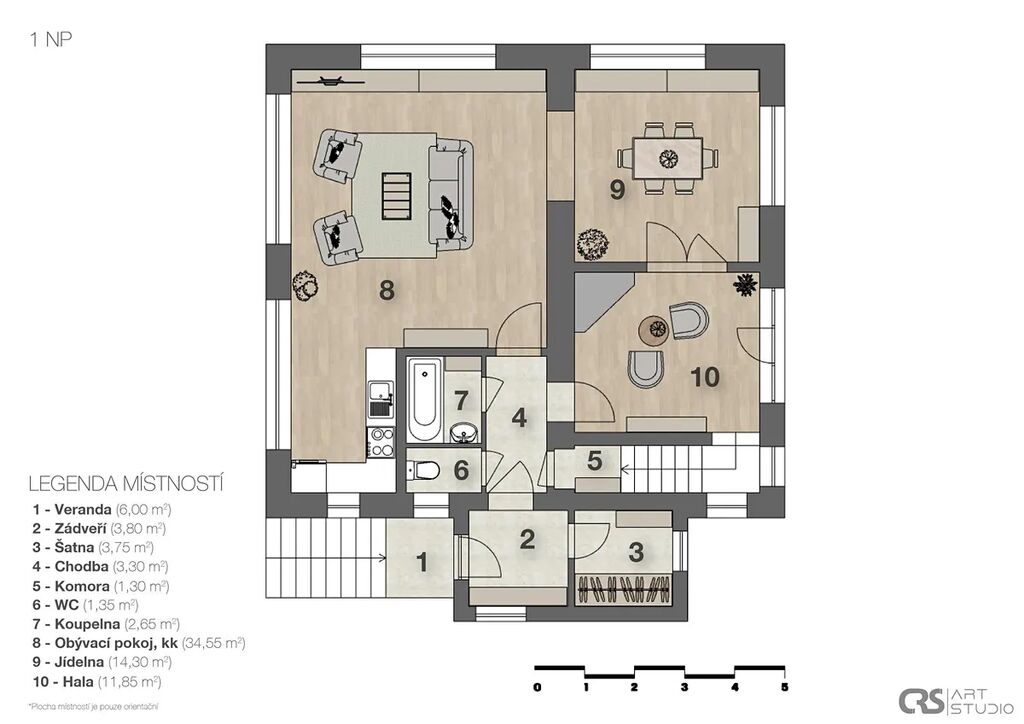 1np: Veranda, zádveří, šatna, chodba, komora, wc, koupelna, obývací pokoj propojen s KK.