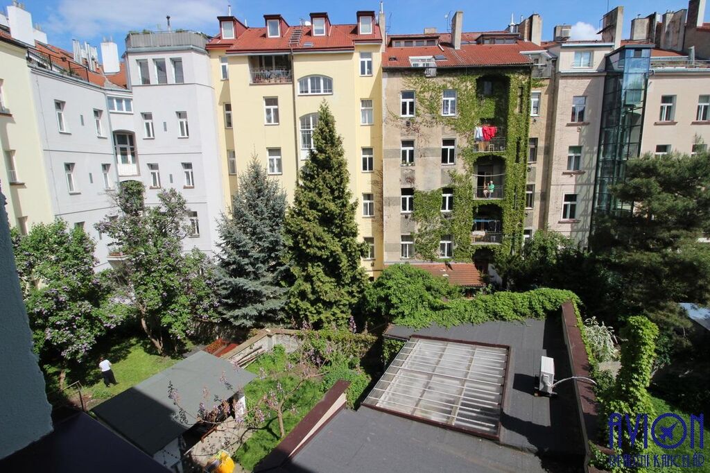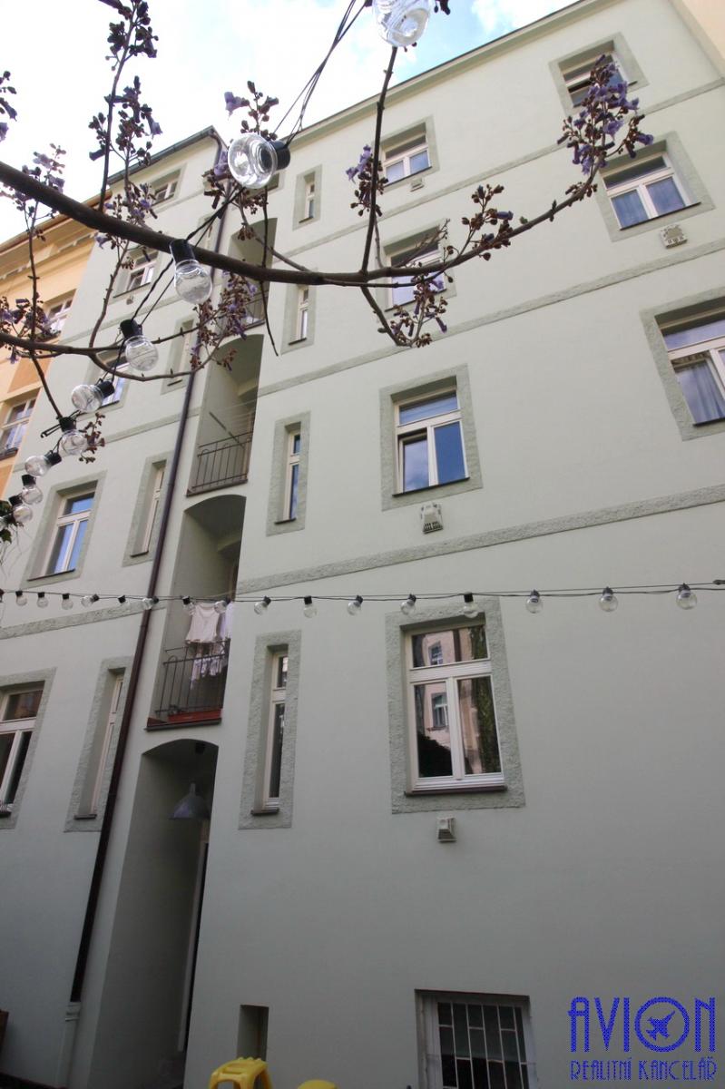 Byt se nachází v 1. patře historického domu s novou fasádou a novými okny. K dispozici je malý dvorek s pěkně udržovanou zelení.