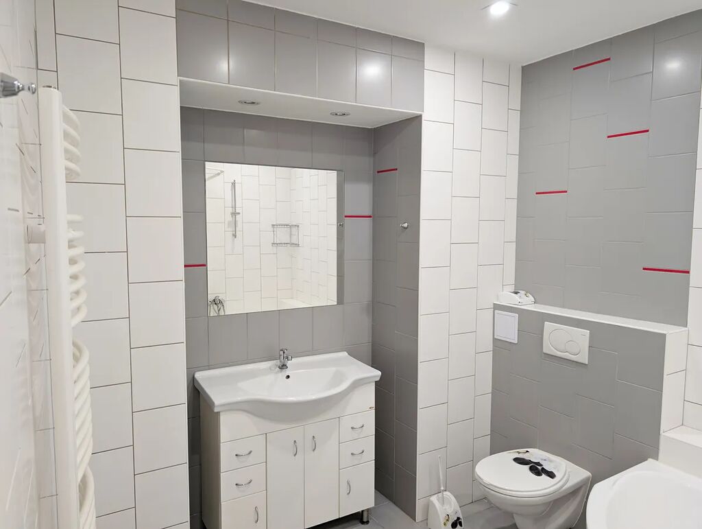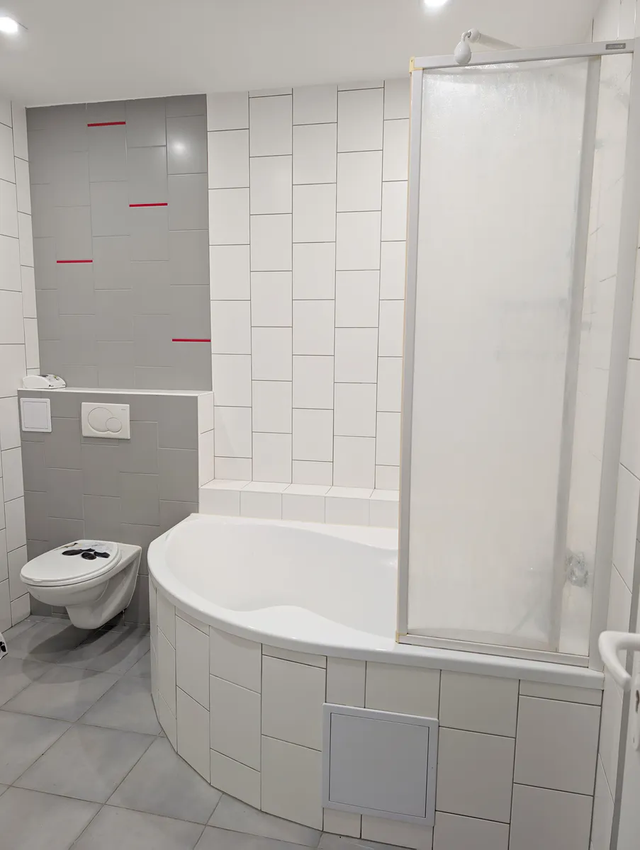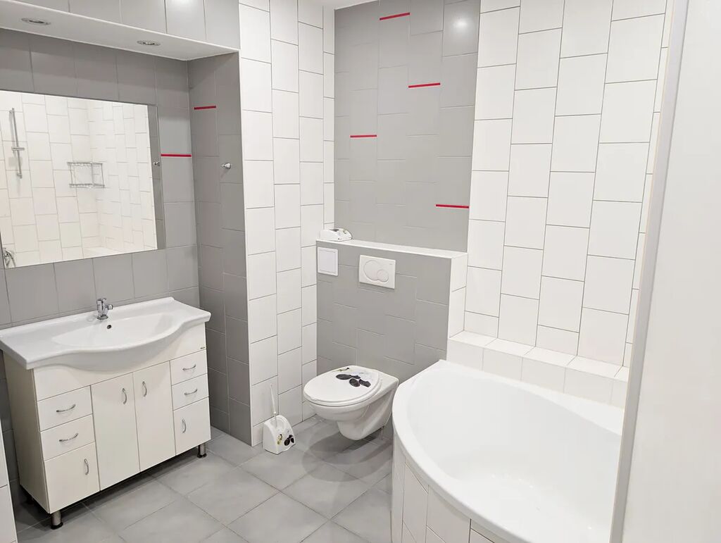 - V koupelně je rohová vana, umyvadlo a žebřík