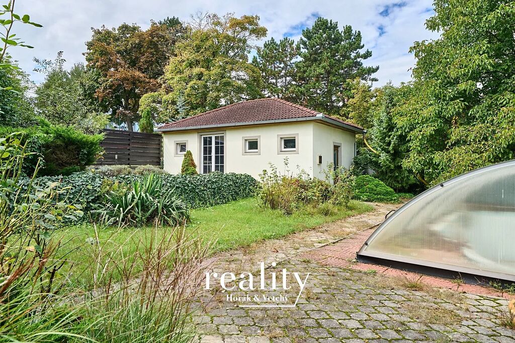 Na zahradě se nachází zastřešený bazén (zde je nutná rekonstrukce) a větší zahradní domek, který byl používán jako ateliér, můžete v něm ubytovat hosty nebo zde vybudovat saunu, či posilovnu.