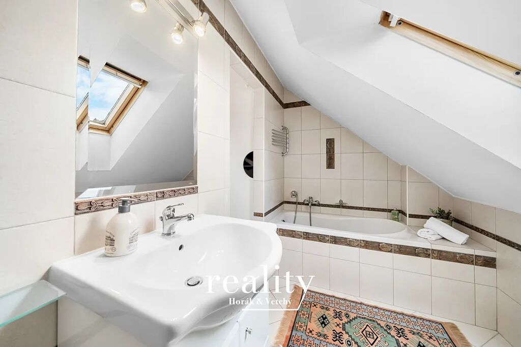V 1. patře je obývací pokoj s krbem, kuchyň s jídelnou a obývacím koutem, romantická ložnice s přilehlou koupelnou skrytou za šatní skříní. Dále ložnice, samostatná koupelna a komora.