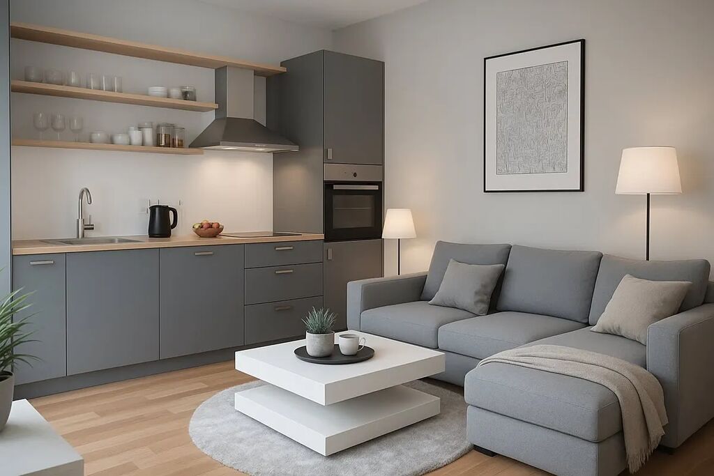 Byt disponuje prostorným obývacím pokojem s kuchyňským koutem, jednou samostatnou ložnicí a koupelnou se sprchovým koutem. Kuchyně je plně vybavená moderními spotřebiči, včetně myčky, lednice a trouby. V obývacím pokoji jsou velká okna, která zajišťují dostatek přirozeného světla a vytvářejí příjemnou atmosféru.