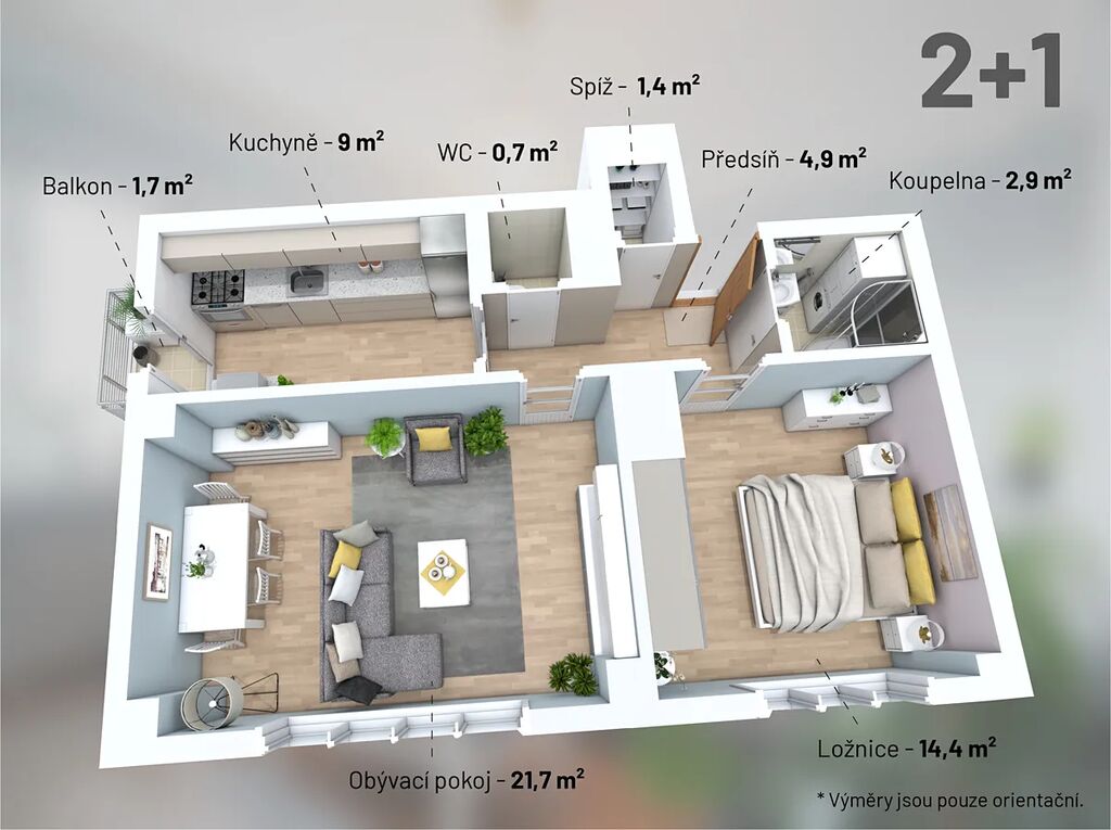 Dispozice: vstupní chodba, koupelna se sprchovým koutem a pračkou, samostatná toaleta, obývací pokoj, ložnice a kuchyně. Kuchyň je vybavena lednicí, myčkou, troubou a varnou deskou. Z kuchyně je vstup na balkon. K dispozici je také spíž (cca 1,5 m²).