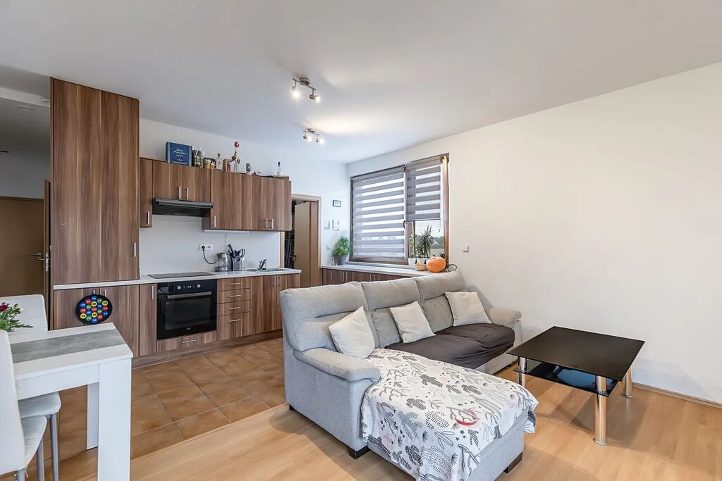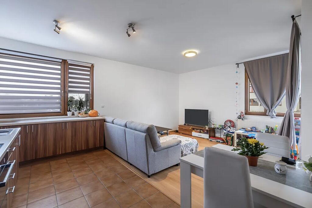Byt o podlahové ploše 53,5 m² je dispozičně řešen velmi prakticky. V bytě se nachází praktické zádveří, ze kterého se dostaneme do centrální chodby ze které je vstup do ložnice, koupelny a dostanete se z ní až do obýváku spojeného s kuchyní. Co jistě oceníte, je praktická špajz za kuchyní. Z obývacího pokoje máte navíc vstup na terasu o velikosti 5,5 m² kde můžete trávit volný čas. K bytu náleží také společný sklepní prostor.