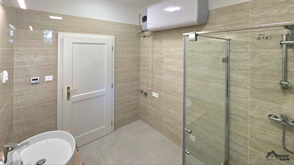 Sanita: sprchové kouty z bezpečnostního skla, umyvadlo na skříňce (dub).