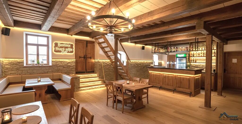 Prostory bývalého mlýna: Z chodby se vchází do prostorné místnosti v 1. NP, která Vás uchvátí podlahami, stropy a schodištěm z masivního dřeva. Schodištěm se dostanete jak do přízemí (dvě místnosti, druhý vstup a průchod do uzavřených podzemních částí) tak do podkroví (dvě další místnosti).