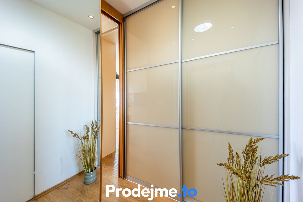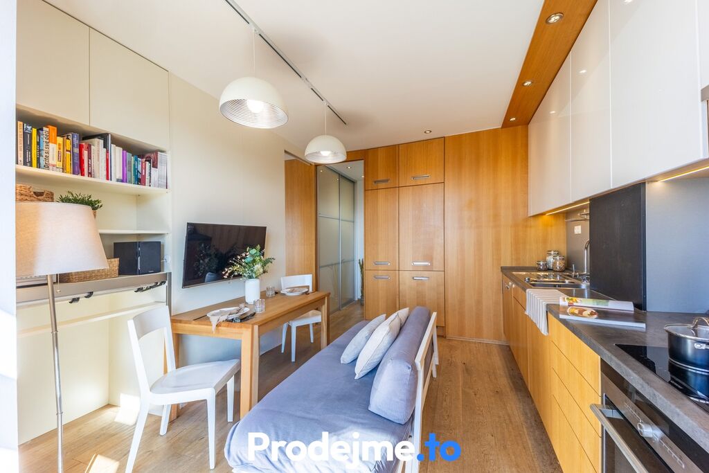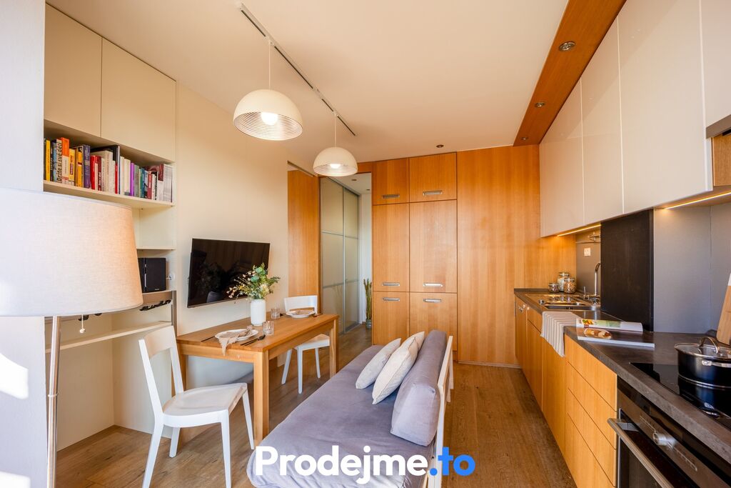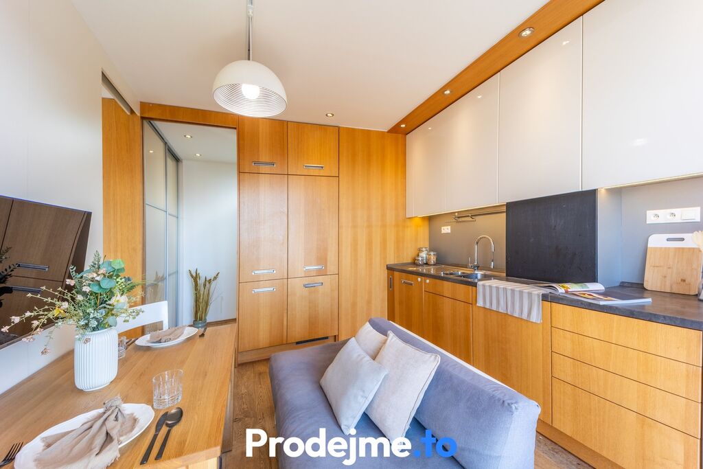 V roce 2013 byt prošel rekonstrukcí – dostal novou kuchyňskou linku, vestavěný nábytek i podlahy z dřevěných parket. Původní dispozice 2+kk (uvedeno v Prohlášení vlastníka) byla díky chytré vestavbě nábytkové stěny rozšířena na 3+kk. Pokud by vám vyhovovala spíše otevřenější varianta, stačí stěnu jednoduše demontovat a získáte prostorný obývací pokoj s kuchyňským koutem.