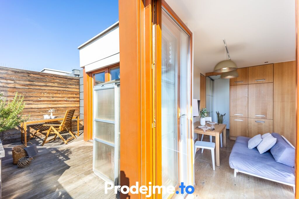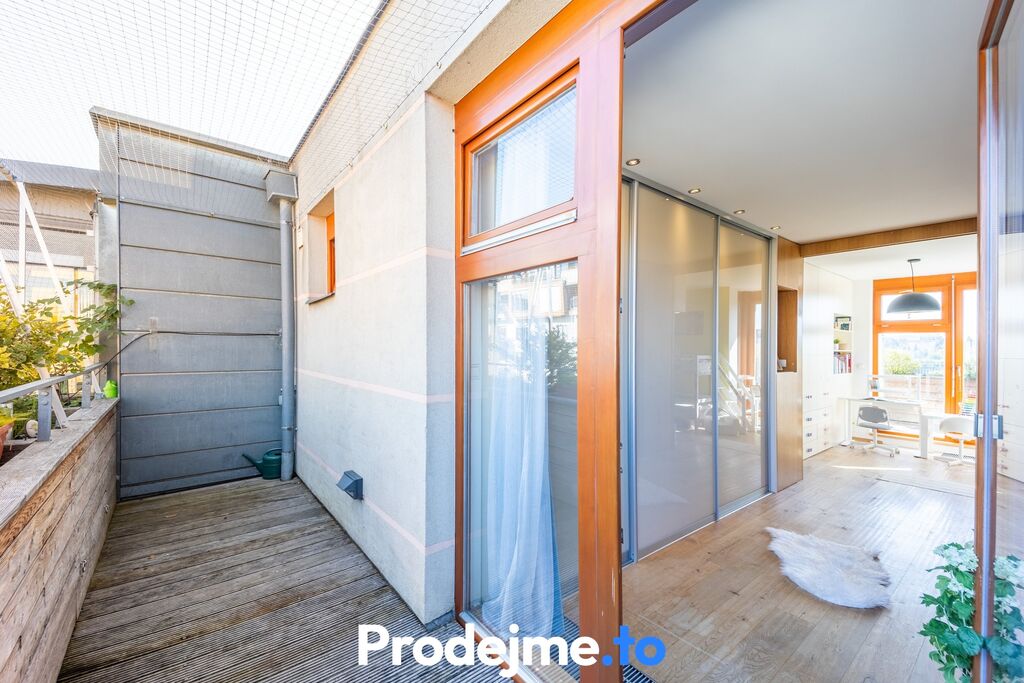 Velkým bonusem tohoto bytu jsou dvě prostorné terasy s dřevěným obložením. Severní terasa o 14,5 m2 je ideální pro klidné posezení ve stínu, jižní o velikosti 18,2 m2 vám zase dopřeje slunce po celý den. Můžete si tak vybrat podle nálady i denní doby. Kromě relaxace na čerstvém vzduchu ocení nadšení pěstitelé i malý skleník a truhlíky s automatickou závlahou, které dotvářejí příjemnou atmosféru.
