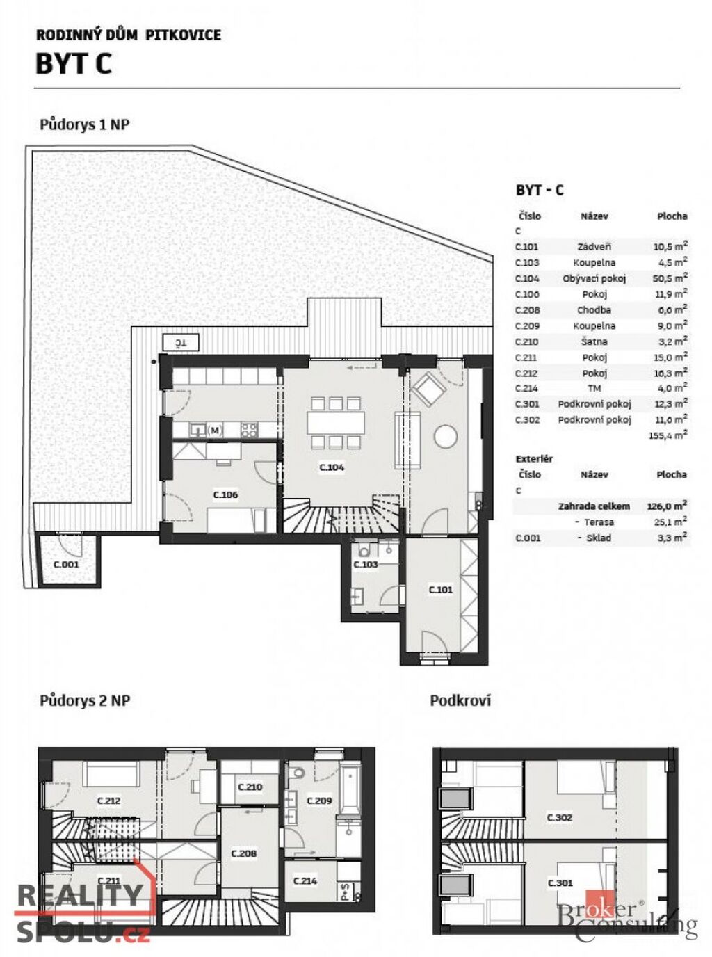 Byt je řešen jako mezonetový byt o užitné ploše 155,4 m², se zahradou 126 m², terasou 25 m² a zahradním skladem 3,3 m². K jednotce náleží dvě parkovací stání s přípravou pro nabíjení elektromobilu.
