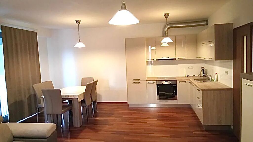 Byt je zařízený. Kuchyň je vybavená kuchyňskou linkou a elektrospotřebiči.