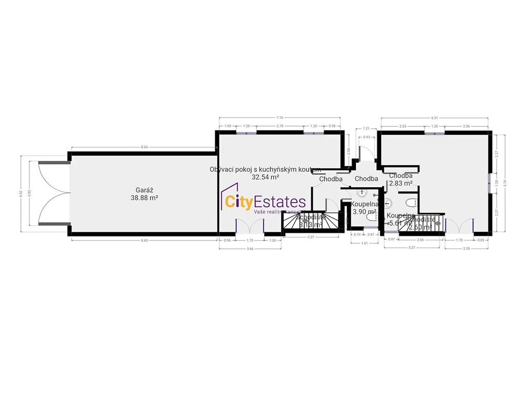 Užitná plocha bytů je celkem 168 m2, garáž má 38m2, celková užitná plocha je 206m2.