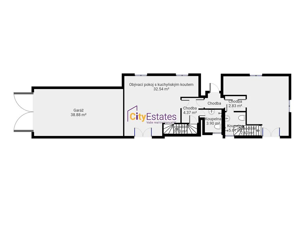 Byt má podlahovou plochu 84m2, největším pokojem je obývací pokoj s kuchyňským koutem o výměře 32 m2. V přízemí se ještě nachází koupelna s toaletou. V patře jsou dvě ložnice.