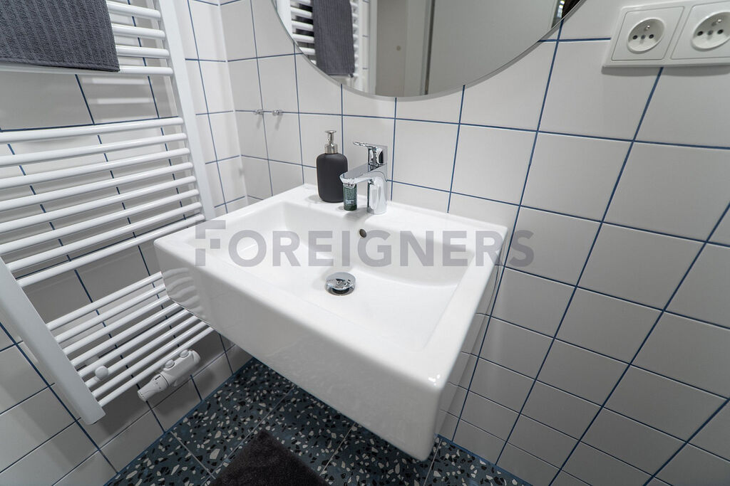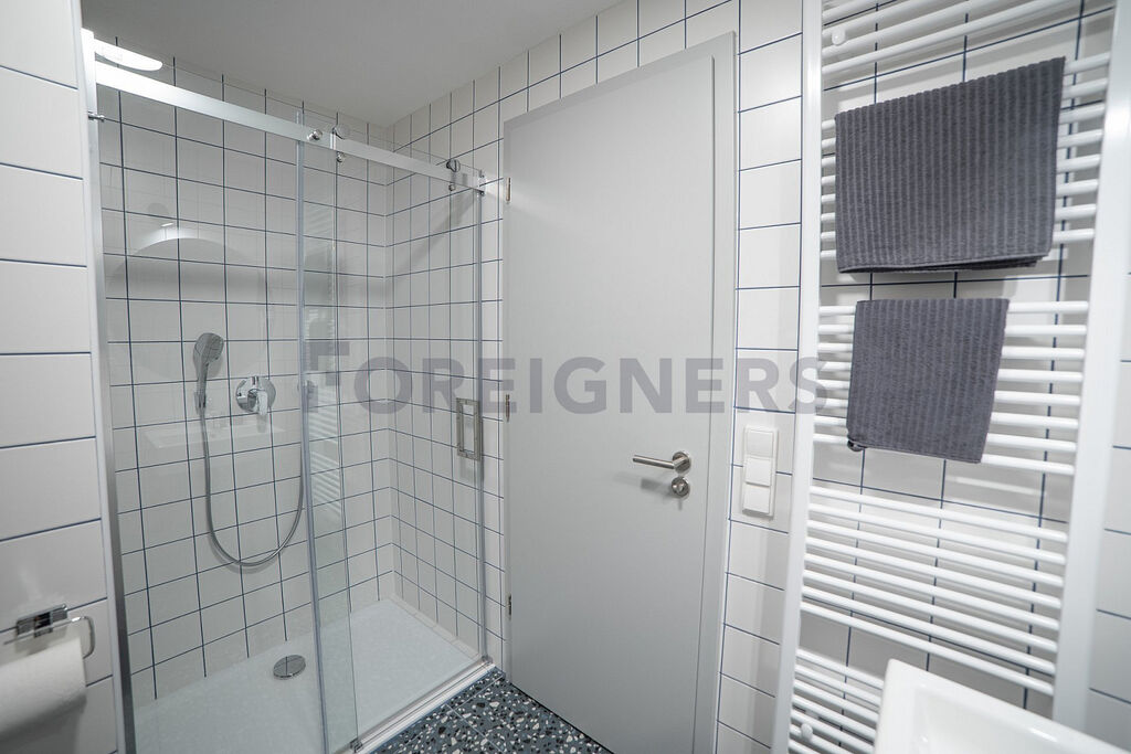 Koupelna je vybavena umyvadlem, zrcadlem, WC, sprchovým koutem, úložným boxem, ventilátorem a topným žebříkem.