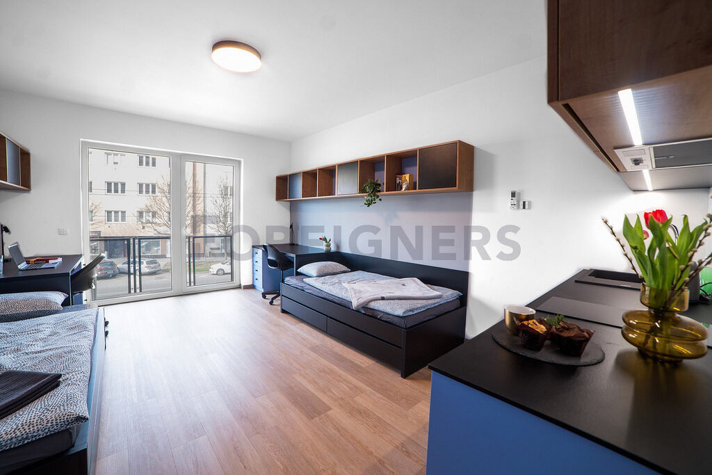 Studio dále zahrnuje 2 pracovní stoly s úložným boxem (vel. stolu 150 x 75 cm) + 2x židle; 2 jednolůžkové postele s úložným prostorem, 2 knihovny; 2 lampičky; magnetickou stěnu; 2 šatní skříně.