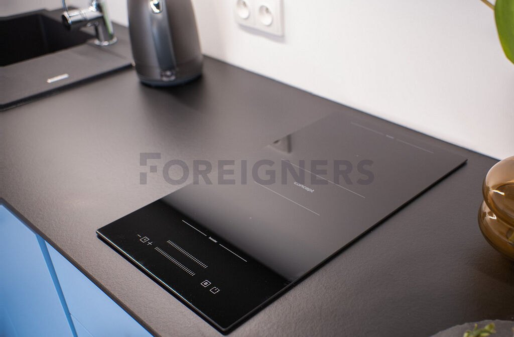 Kuchyňská linka s dřezem je vybavena všemi potřebnými spotřebiči a zařízením -dvouzónová indukční varná deska, myčka, digestoř, lednička, mikrovlnná trouba, vestavné odpadkové koše.