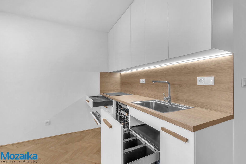 Vstoupíte do prostorné chodby s praktickými vestavěnými skříněmi, které poskytují dostatek úložného prostoru a také místem pro pračku a vlastní plynový kotel ústředního topení. Dominantou bytu je světlý obývací pokoj propojený s kuchyní vybavenou moderní kuchyňskou linkou, kde najdete kompletní vybavení včetně vestavných spotřebičů - lednice, mrazničky, indukční varné desky, trouby a myčky nádobí. Vše je zcela nové a čeká na svého prvního nájemce. Byt dále nabízí komfortní ložnici, další samostatný pokoj ideální pro pracovnu či dětský pokoj, elegantní koupelnu se sprchovým koutem a samostatné WC pro větší pohodlí. V chodbě jsou velké šatní skříně a v jedné z nich je schovaný také kotel ústředního topení a po ním místo pro pračku s napojením na odpady a vodu. Vlastní kotel ústředního topení Vám zajistí flexibilitu v určení délky topné sezony.