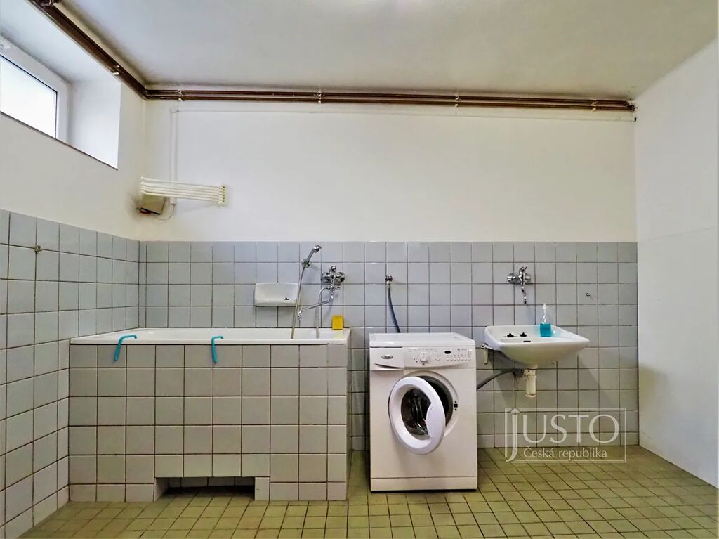 V suterénu domu je garáž pro parkování dvou vozů za sebou. Prádelna je vybavená praktickou vanou pro ruční praní, pračkou atd. Z prádelny je vstup do sklepa, který sloužil pro uchování zeleniny.