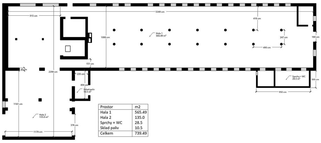 Celková užitná plocha objektu je více než 700 m2. Objekt má hlavní přístup přes elektrická vjezdová vrata o šířce 3,7 m a výšce 3,6 m. Světlá výška v přední části objektu je 3,8 m. Pro vytápění se využívá teplovzdušný automatický kotel na peletky s výkonem 49 kW a kotel na dřevo s výkonem 15 kW. Pravidelná dodávka pelet je možná za výhodné ceny, protože jejich výroba probíhá ve vedlejší hale. Hodnota hlavního jističe 3 x 80A. Prostory prošly celkovou rekonstrukcí včetně vybudování WC a sprch.