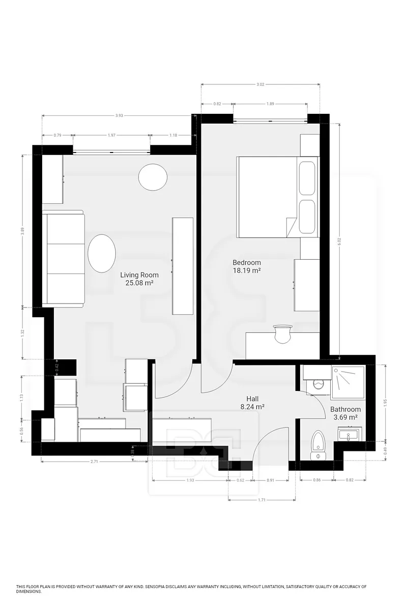 Byt je nabízen kompletně zařízený. Obývací pokoj s kuchyňským koutem je vybaven moderní kuchyňskou linkou se spotřebiči (myčka, lednice s mrazákem, varná deska, trouba, mikrovlnná trouba) a dále pohodlnou pohovkou, komodou a televizní stěnou.