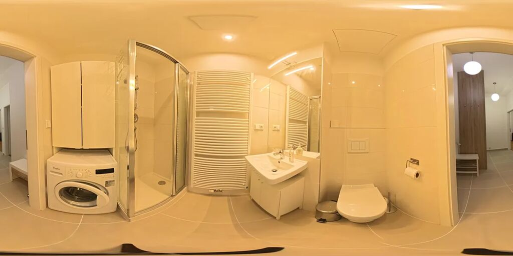 Koupelna je vybavena sprchovým koutem, toaletou a pračkou.