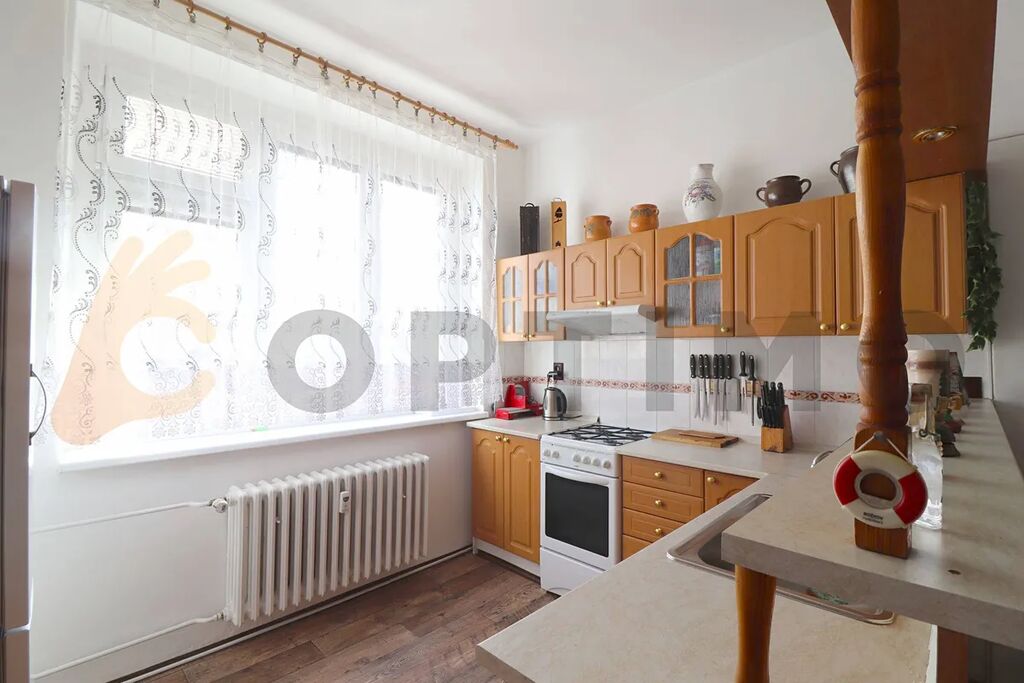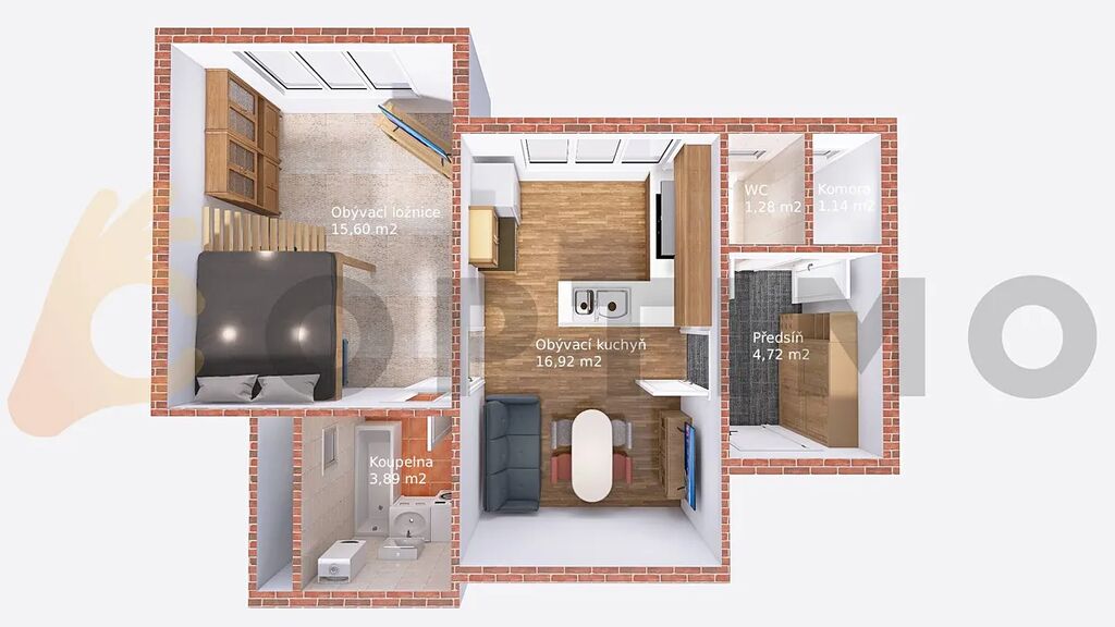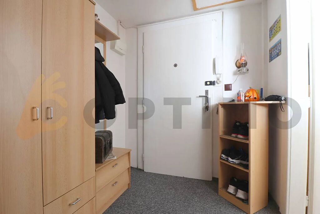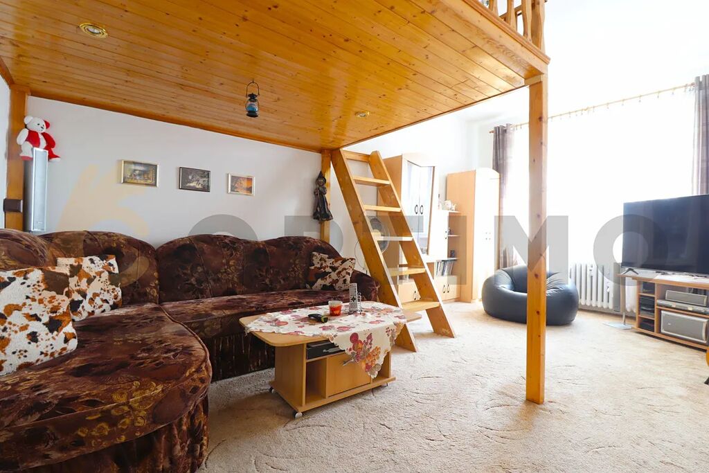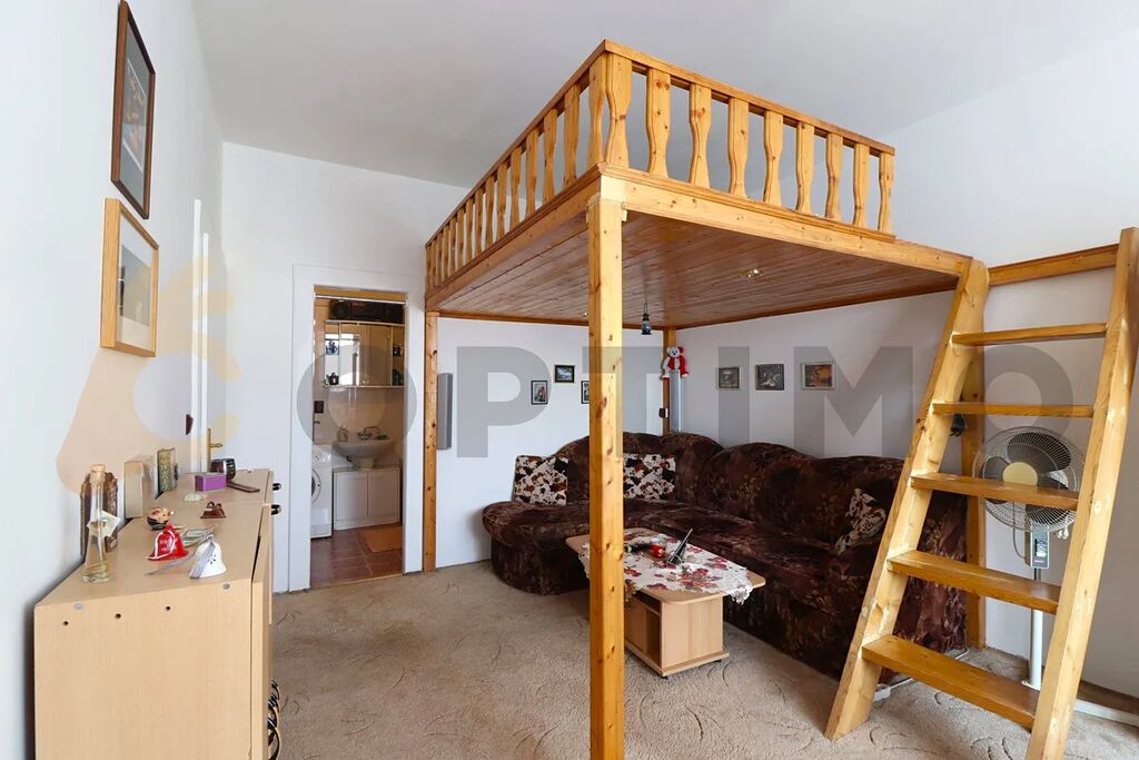 Čistý, světlý byt s volným výhledem v dobrém stavu je ideální volbou pro mladé páry nebo jednotlivce. Praktická dispozice s minimem nevyužitých ploch. Po vstupu menší předsíň (4,72 m2) se vstupem do komory (1,14 m2), na samostatnou toaletu (1,28 m2) a do obývací kuchyně (16,92 m2). Ta je průchozí do obytné ložnice (15,60 m2) s vestavěným patrem na spaní. Ta je taktéž průchozí do koupelny (3,89 m2) s vanou a místem na pračku.