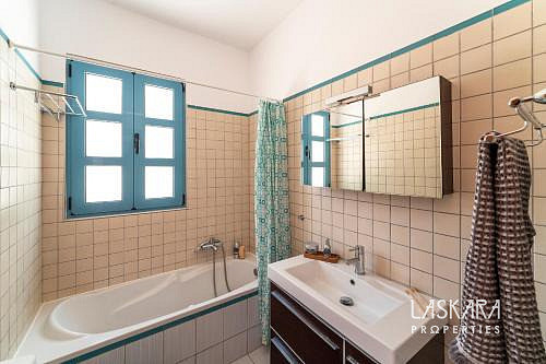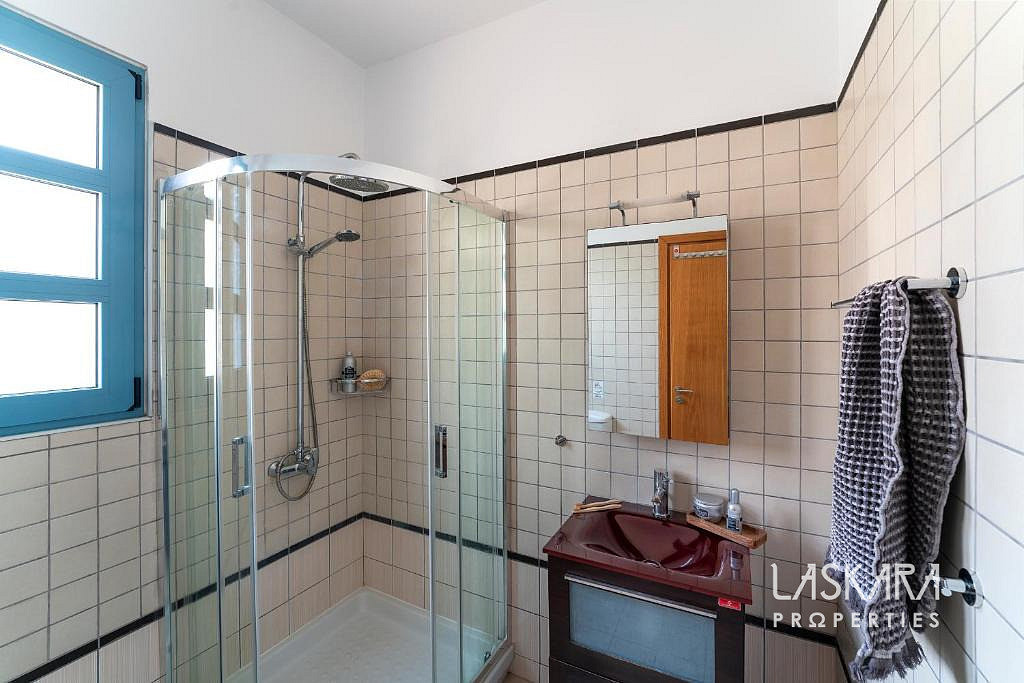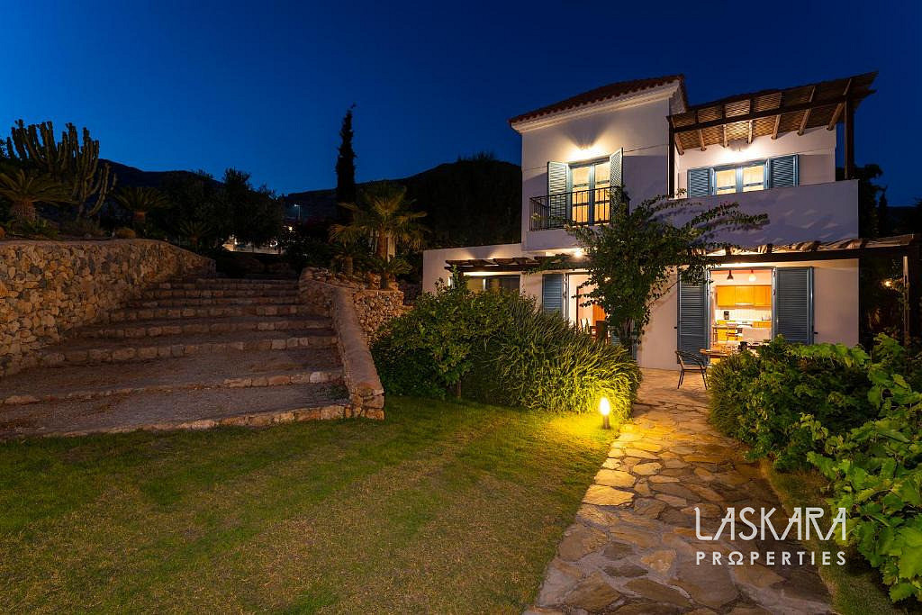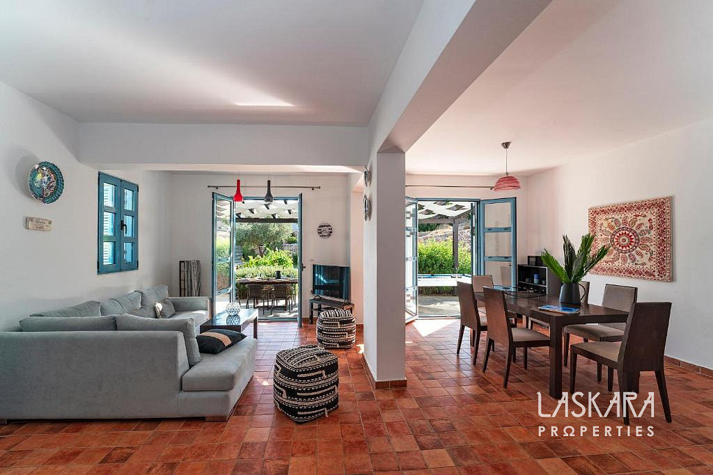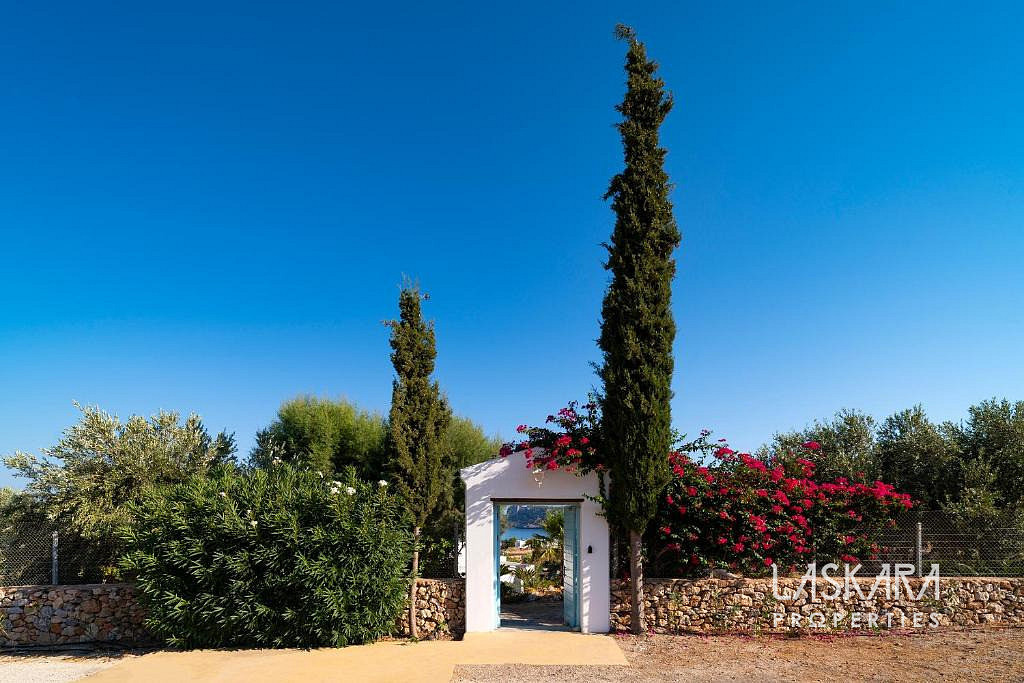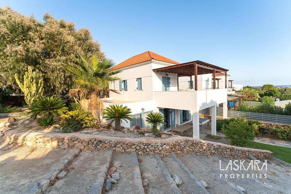 Villa Navarone View – bílý dům se světle modrými okenicemi – stojí na vyvýšeném místě, odkud se před vámi otevírá nekonečný horizont Egejského moře.
