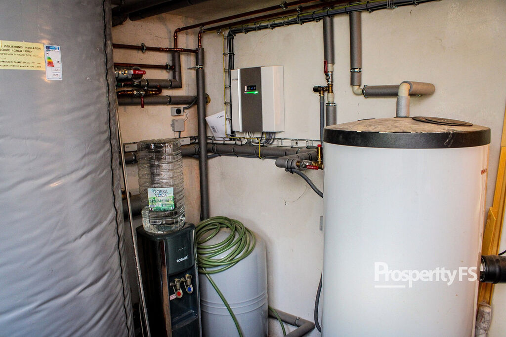 Dům je napojen na elektřinu, vlastní studnu a domácí ČOV, vytápění zajišťuje tepelné čerpadlo s možností záložního kotle na tuhá paliva.