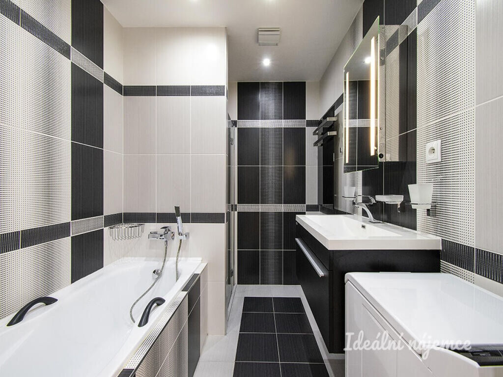 Byt se nabízí částečně vybavený. Kuchyňský kout disponuje moderní kuchyňskou linkou se spotřebiči - sklokeramická indukční deska, elektrická trouba, digestoř, mikrovlnná trouba, lednice s mrazákem, myčka nádobí. K dispozici je také jídelní stůl a židle. Obývací část je vybavena sedací soupravou, konferenčním stolkem, TV stěnou a televizí. V ložnici se nachází manželská postel a šatní skříň se zrcadlem. Třetí místnost je vybavena postelí a šatní skříní se zrcadlem. Koupelna disponuje vanou, sprchovým koutem, zrcadlem a skříňkami. Toaleta je zvlášť se skříňkami a zrcadlem. V bytě se nachází také šatna vybavena úložnými prostory.