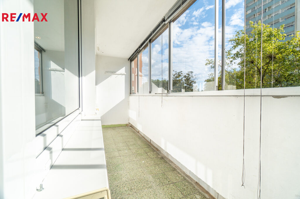 Prostorná zasklená lodžie poskytuje příjemné místo pro ranní kávu nebo večerní odpočinek.