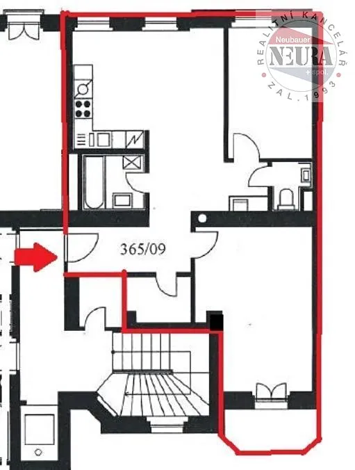 obývací pokoj s kuchyňským koutem 22,80 m2, ložnice 10,5 a 17 m2, jedna ložnice s balkonem 3,3 m2 je orientována do dvorního traktu (zde na okně vertikální žaluzie), kuchyňská linka se spotřebiči (el. varná deska s troubou, myčka), koupelna s vanou a pračkou, samostatné WC s umyvadlem, komora (šatna), vlastní plynový kotel v bytě, vestavěné skříně v chodbě,