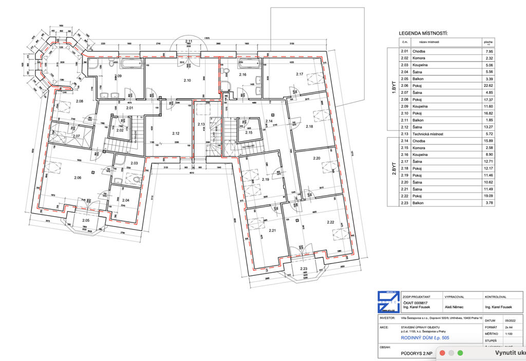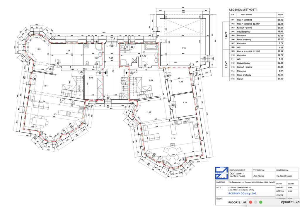 - Současná dispozice: 2 samostatné bytové jednotky, každá o výměře 230 m² s dispozicí 6+kk