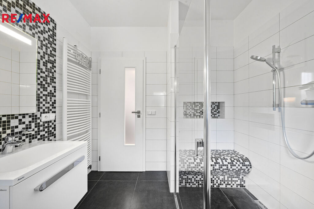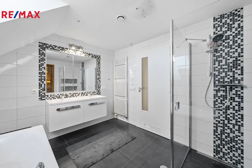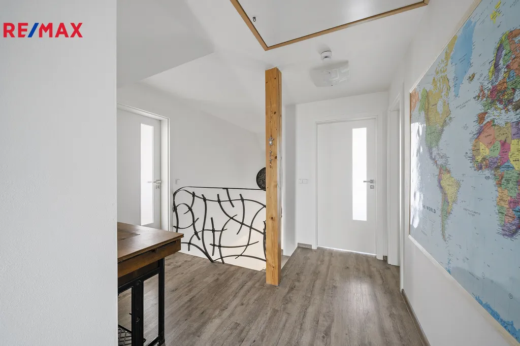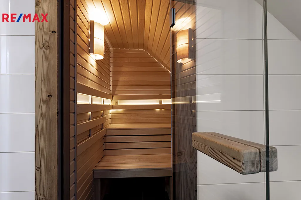 V patře domu jsou dva samostatné a prostorné pokoje, hlavní ložnice, kde každý pokoj má vlastní šatnu. Šatnám dodává světlo střešní okna. K dispozici je také samostatné WC a luxusní koupelna s vanou, sprchovým koutem, dvojumyvadlem a profesionální finskou saunou. Součástí domu je i půdní prostor přístupný skládacími schody, využitelný jako úložný.