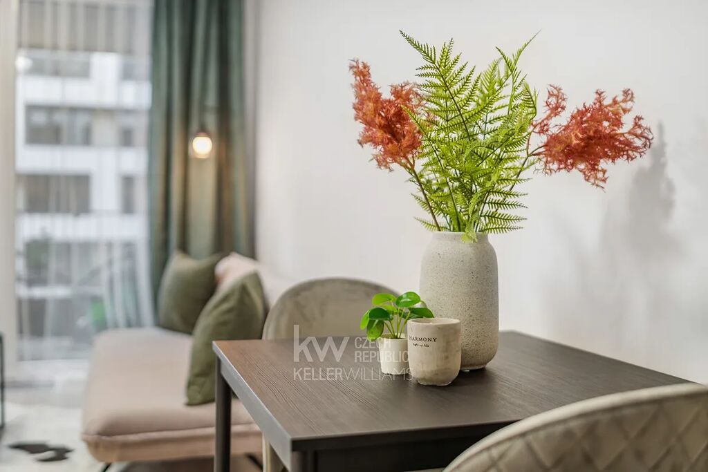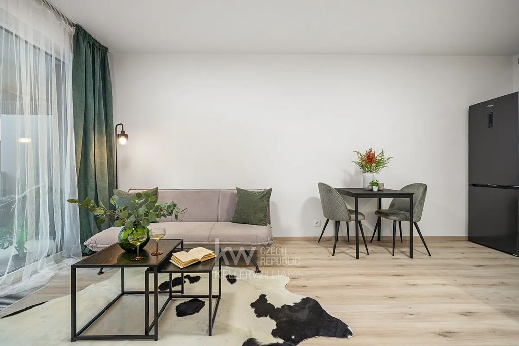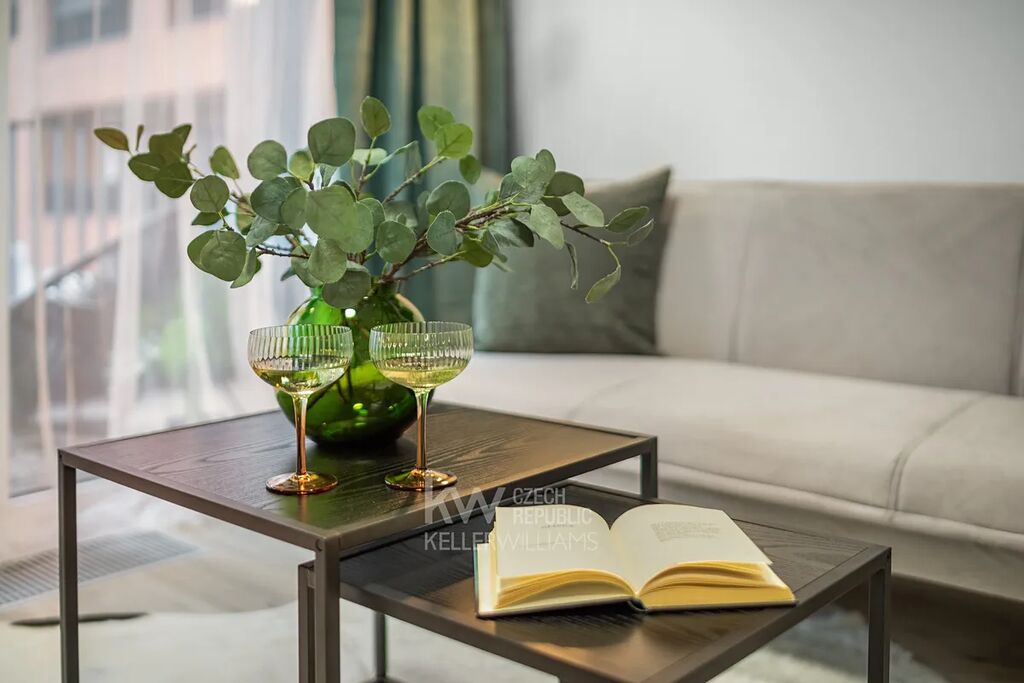 Nábytek, který vidíte na fotografiích, je možné odkoupit. V okolí je spoustu zeleně na venčení, či procházky.