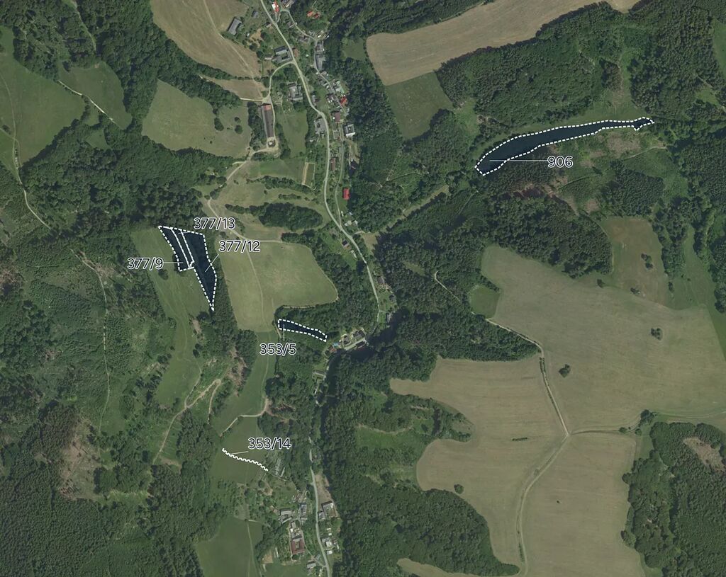 Jedná se o následující parcely: parc. č. 353/5, 353/14, 906, 377/12 a 377/9, které jsou vedené jako trvalý travní porost o celkové výměře 18 876 m². Dále je součástí prodeje parcela č. 377/13, která je vedena jako lesní pozemek s výměrou 1 177 m². Celková výměra prodávaných pozemků činí 20 053 m².