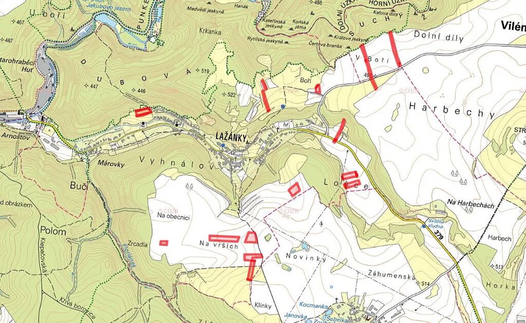 - na listu vlastnictví 47 pod parcelními čísly 343/52, 647/4, 672/4, 673/3, 679/7, 680/3, 717/65, 734/3, 736/12, 770/23, 770/24, 770/25, 771/7, 771/8, 805/2, 805/3, 813/19, 875/57, 875/58, 875/59, 875/60, 875/159 a 878/14 v KÚ Lažánky u Blanska,