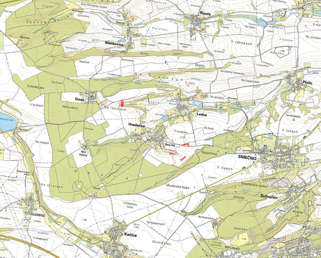 – Hradečno (LV 353 a 465): parcely č. 61/1, 61/34, 553/2, 556/9, 572/14, 600/13, 600/22, 600/29