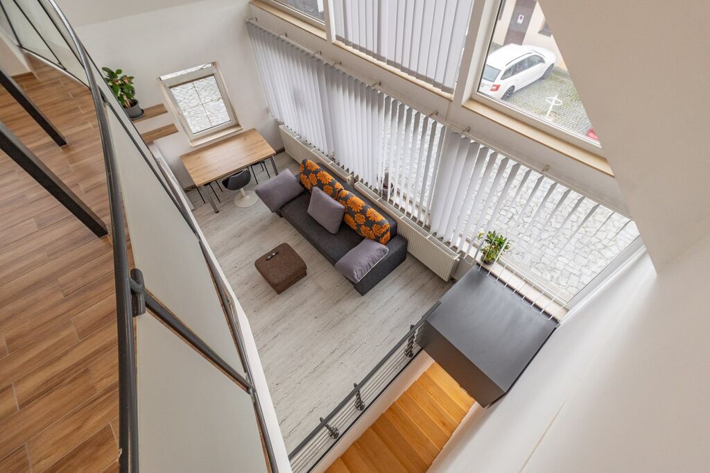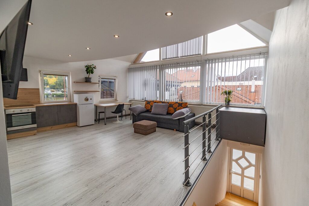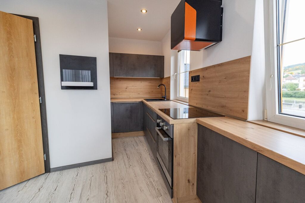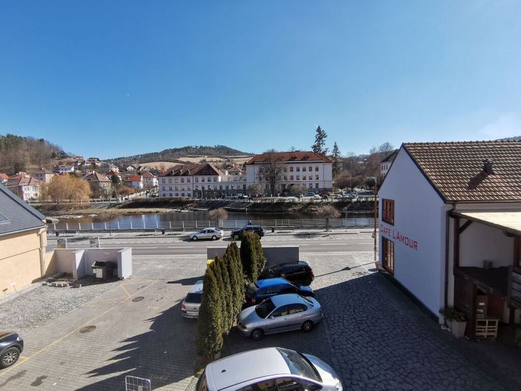 Nabízíme k pronájmu nadstandardní mezonetový byt v moderním vkusném stylu o dispozici 2+kk ve zděném domě v 1. - 2. patře v centru města Sušice. Tento byt s celkovou obytnou plochou 60 m2 vyniká právě svou volností a lehkostí v příjemném nadstandardu, zrovna tak je vybaven novější kuchyní na míru a podlahovými krytinami. Vnitřní dispozice: po schodech v I.patře o výměře 35m2: vzdušný pokoj s TV, menší sedačkou, pracovním stolem, novou kuchyní (el. sporák se sklokeramickou deskou, myčkou, chladničkou), koupelna s pračkou, vanou, WC a předsíňový meziprostor. V podkroví o výměře 25m2: pokoj / ložnice s úložným prostorem. Tento byt současně nabízí příjemný výhled na nábřeží s řekou a vrchol Anděla Strážného. Součástí nájmu lze využívat parkovacího stání ve dvoře domu. Vytápění ústředním topením el. kotlem s vlastním elektoměřičem. Platby spojené s užíváním bytu: nájem 14.500,-Kč/měs. (včetně vody) + zálohy na el. energii. Volné od 1.11.2025.