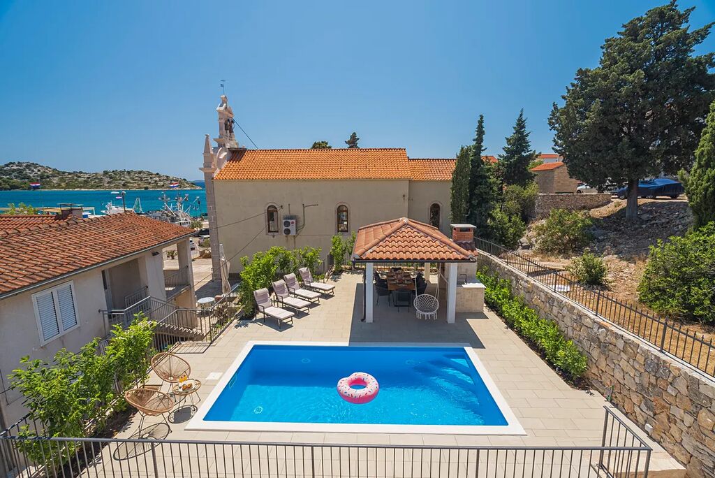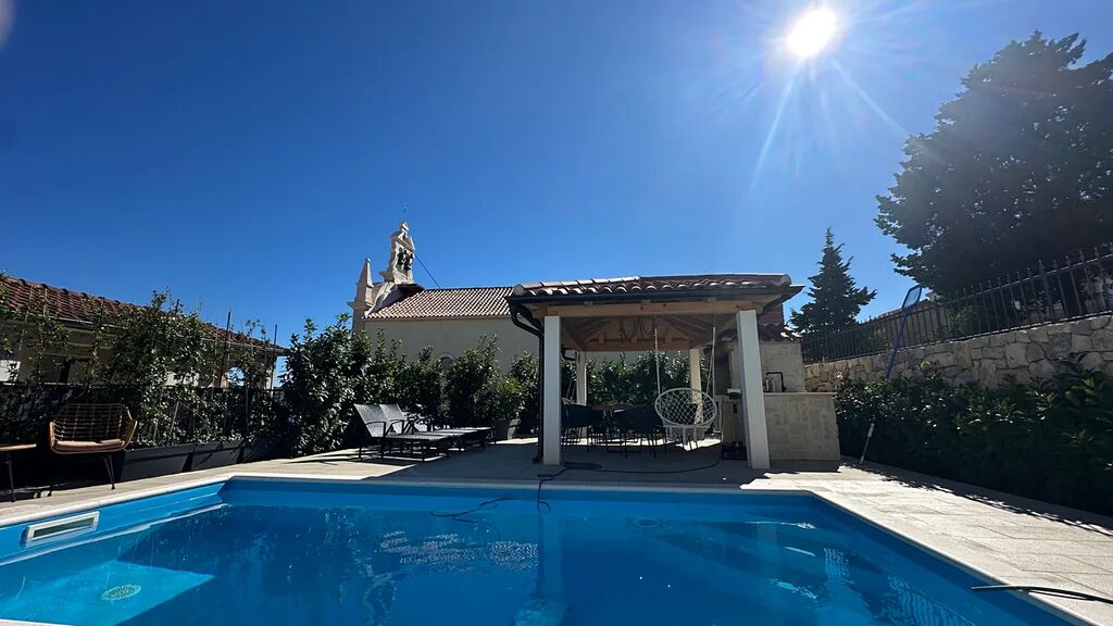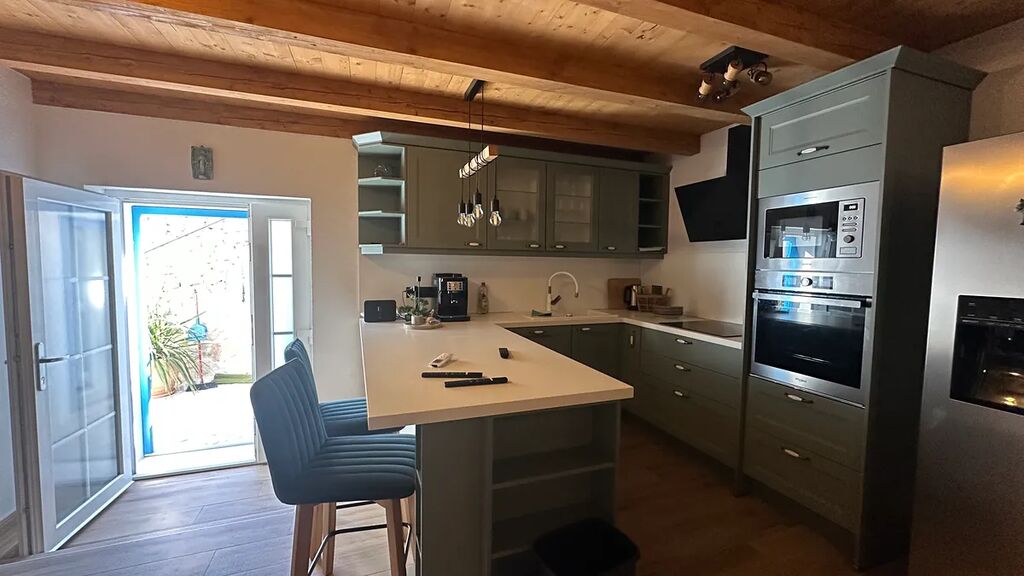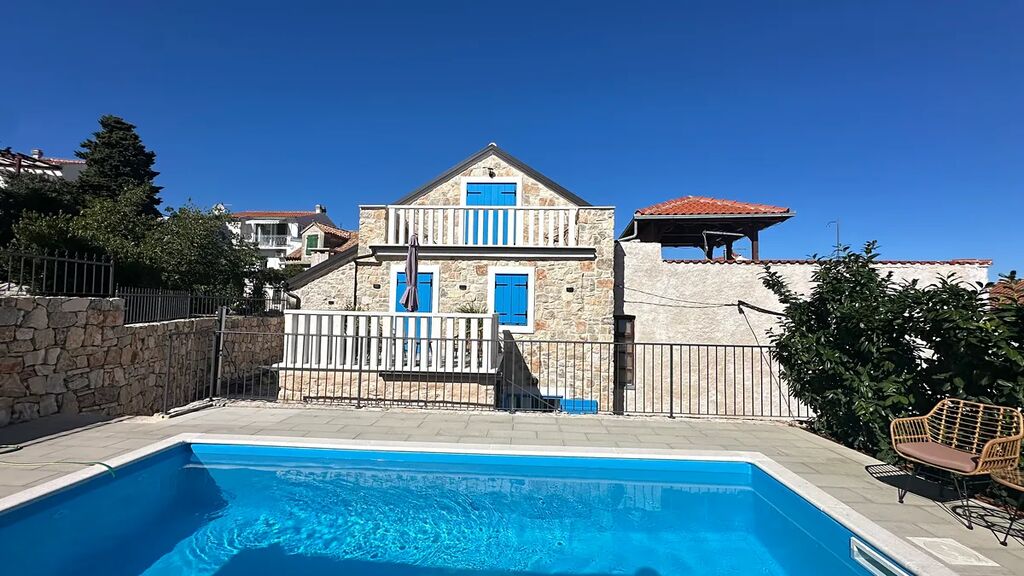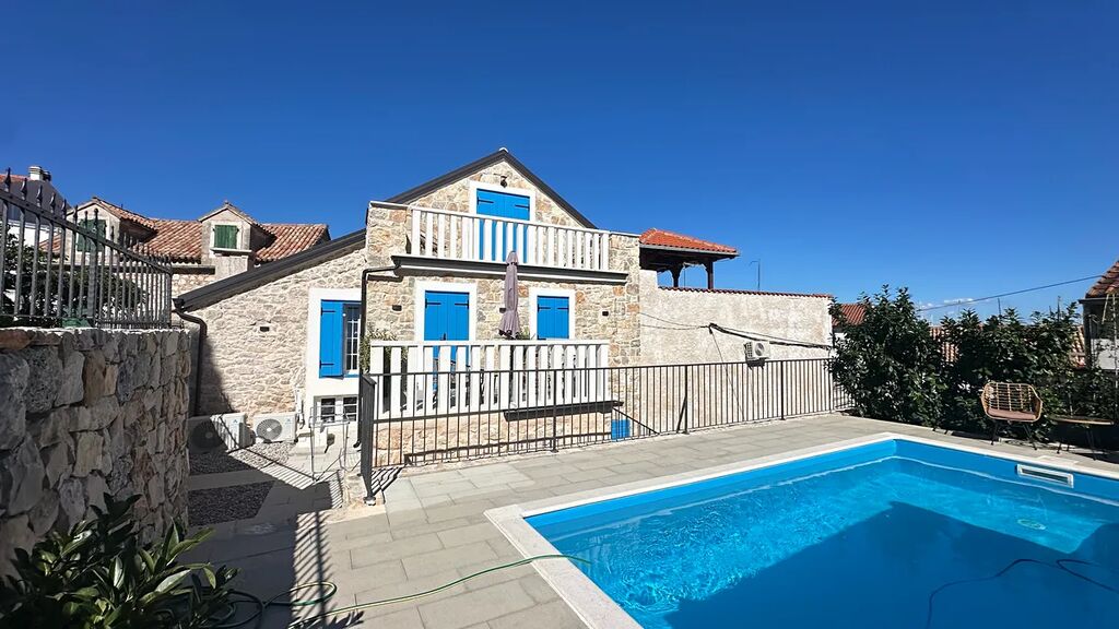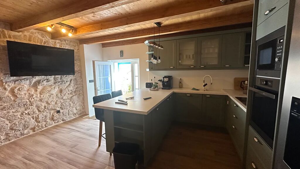 Nádherný, autentický samostatně stojící kamenný dům se zahradou, bazénem a výhledem na moře v centru Tribunje. Dům je třípatrový s celkovou užitnou plochou 137,91 m². V roce 2024 byl kompletně zrekonstruovaný v dalmatském stylu s použitím vysoce kvalitního vybavení a nábytku. Přízemí se skládá z kuchyně, obývacího pokoje, jídelny s vnitřním krbem/grilem a vinným sklepem, toalety a úložné místnosti. Vnitřní schodiště vede do prvního patra, kde se nachází chodba, koupelna a dvě ložnice, přičemž každá ložnice má vlastní terasu. V podkroví se nachází prostorná ložnice s koupelnou a terasou s výhledem na dvůr, bazén a moře. Plocha pozemku je 438 m2 a dvůr je kompletně oplocený a upravený s parkovacím místem a velkou plochou na opalování kolem bazénu a krásným přístřeškem s venkovním grilem. Nábytek je kompletně zahrnut v ceně.