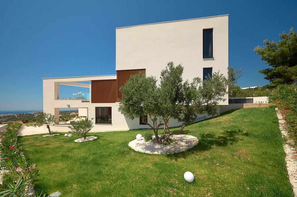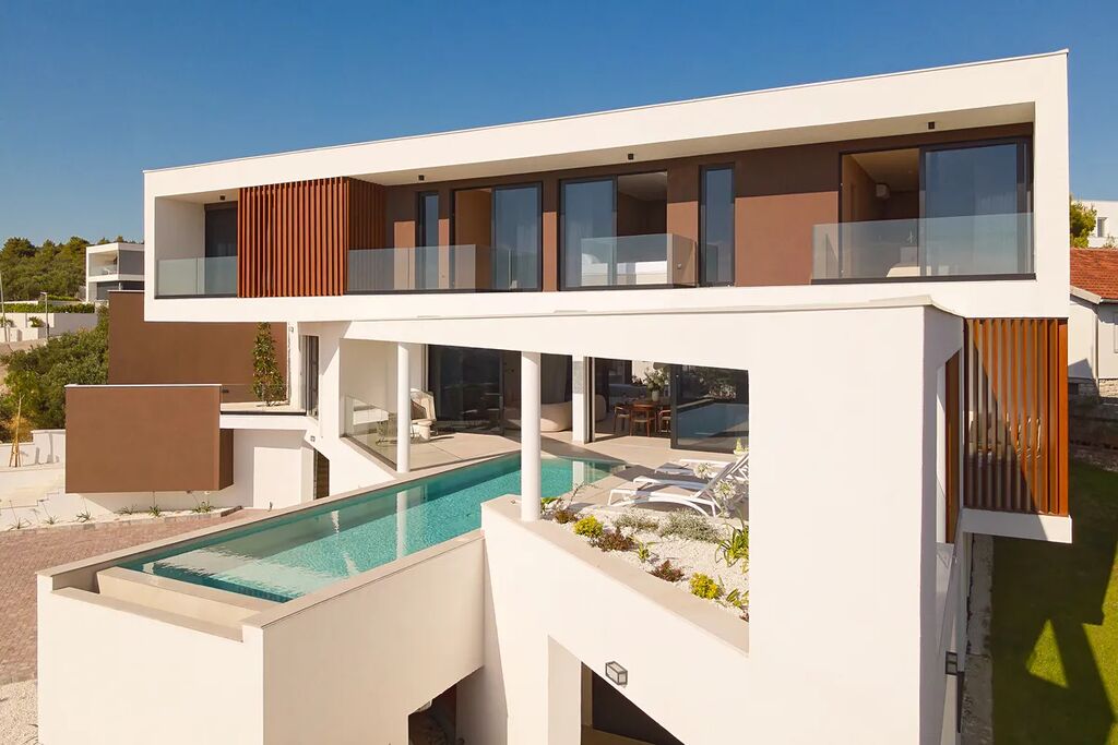 Tato impozantní luxusní vila se nachází v jednom z nejkrásnějších měst Dalmácie a nabízí úchvatný panoramatický výhled na moře a půvabné staré město Primošten. Je ztělesněním moderní elegance, sofistikovanosti a vyniká svým prostorným a světlým interiérem s mimořádným důrazem na estetiku a detail. Vila se nachází na pečlivě upraveném pozemku o rozloze více než 500 m² s udržovanou středomořskou vegetací, jacuzzi, krbem a prostorným parkovištěm. Dispozice vily zahrnuje tři úrovně pro maximální pohodlí a luxus. V suterénu o ploše 268 m2 se nachází apartmán, garáž pro dvě auta, koupelna, sklad a technická místnost. V přízemí o ploše 283 m2 vás přivítá prostorná vstupní hala s šatnou, otevřený obývací pokoj s jídelnou kuchyní a výstupem na terasu s úžasným panoramatickým výhledem na moře, nekonečný bazén, WC, spíž a 3 terasy. Nádherné designové schodiště vás dovede do dalšího patra, kde vás čekají 4 ložnice, každá s vlastní terasou a koupelnou. Moderní vybavení prémiovým luxusím španělským nábytkem zvyšuje komfort a funkčnost vily, včetně elektrické klimatizace v každém pokoji a podlahového vytápění pro zajištění celoročního komfortu. Veřejný vodovod, kanalizace - bio septik.