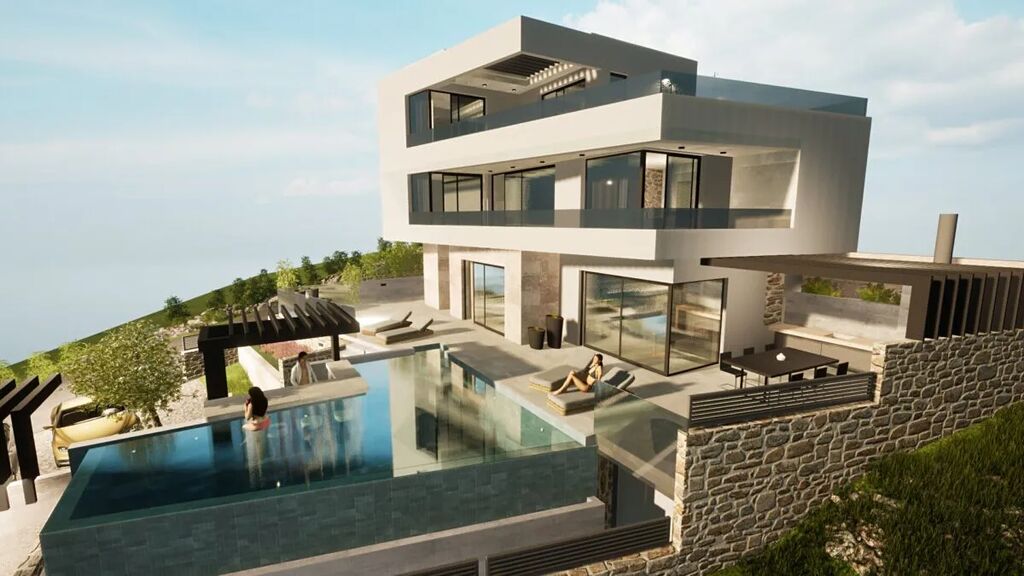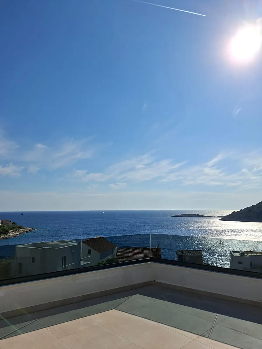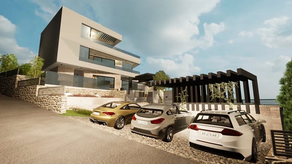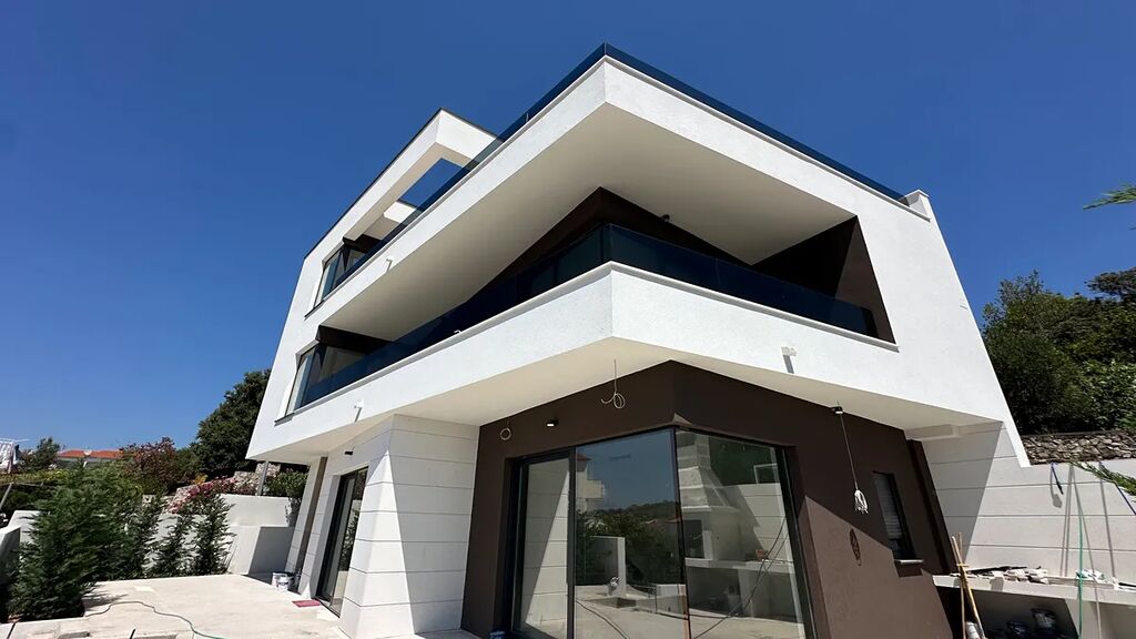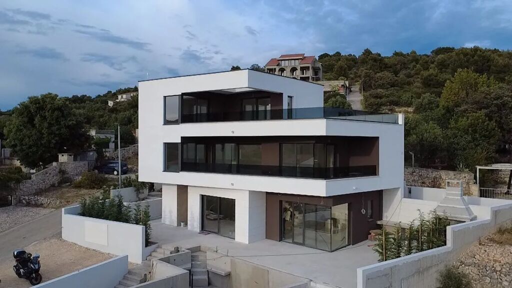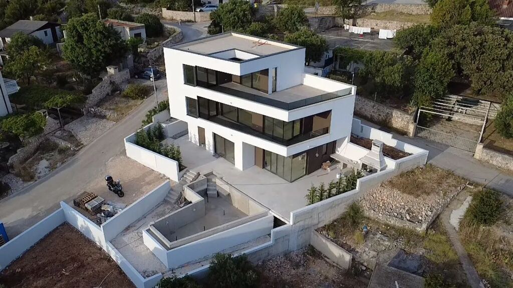 Výjimečná vila ve tvaru diamantu se nachází v zálivu Stivasnica, oblast Rogoznica. Nachází se pouhých 100 metrů od moře s nádherným výhledem na Jadran z každého patra a nachází se přímo v místě, kde se dvě místní silnice spojují do slepé uličky, aby byla snadno dostupná a zároveň s plným soukromím. Vstup do vily je ze severní strany, nachází se nad úrovní přízemí a pár kroků od parkoviště. V přízemí se nachází toaleta, komora, prostorný obývací pokoj s kuchyní a velkou terasou s úžasným nekonečným bazénem, letní kuchyně a venkovní jídelní kout. Umístění pohovky a jídelního stolu nabízí krásný výhled na moře přes velké skleněné posuvné dveře. Nekonečný bazén ve tvaru U má část jacuzzi s masážními čerpadly a je umístěn na stejné úrovni jako přízemí. Zvláštností interiéru je galerie s létajícími nerezovými schody až do druhého patra s velkými prosklenými posuvnými dveřmi v každém patře galerie. První patro nabízí dvě ložnice s vlastní koupelnou a dlouhou terasou, galerii, kterou lze využít jako tělocvičnu nebo knihovnu s velkými prosklenými dveřmi. Ve druhém patře se nachází hlavní ložnice s velkou terasou a jacuzzi, z níž si můžete vychutnat nádherný výhled. Každé patro má maximální výšku 3 m pro zvýšení luxusu této jedinečné vily. Výměra: 300 m2, 3 ložnice, 4 koupelny, podlahové vytápění, klimatizace, 2 parkovací místa, veřejný vodovod, kanalizace - bio septik, rok výstavby 2023.
