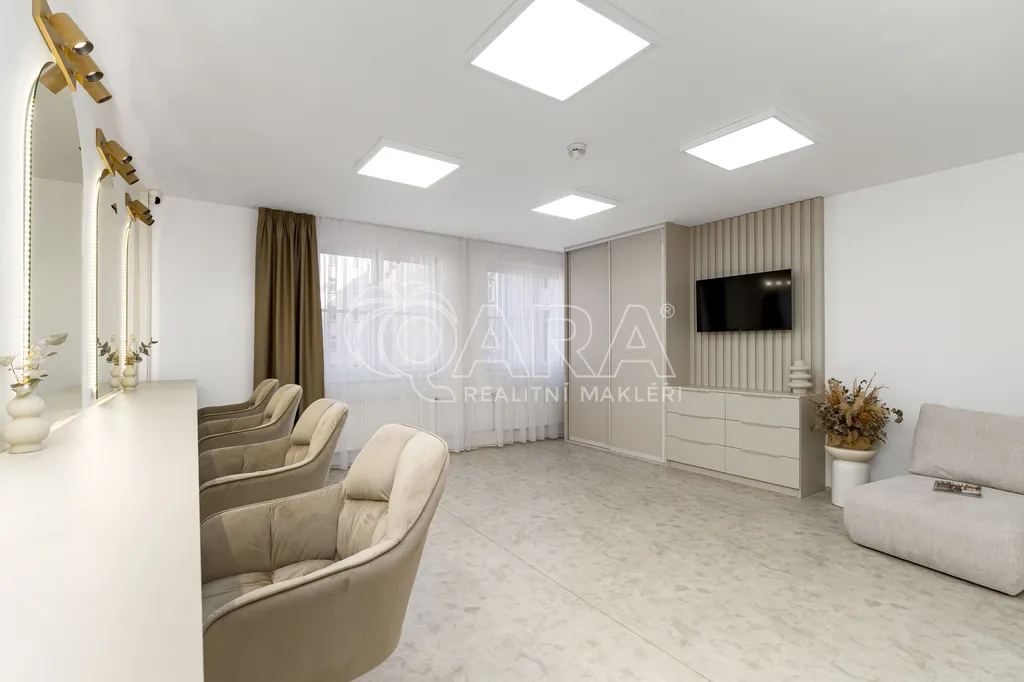 Vybavení: K dispozici je také praktická skříň a komoda pro uložení pracovních pomůcek či textilií, stejně jako záclony a závěsy, které dotvářejí příjemnou a profesionální atmosféru salonu. Křesla a zrdcadla nejsou zahrnuty v ceně, ale je možné jej odkoupit nebo pronajmout. Pokud by vám tento prostor nevyhovoval, na stejném podlaží máme k dispozici také druhý — podívejte se na naši nabídku v inzerci.