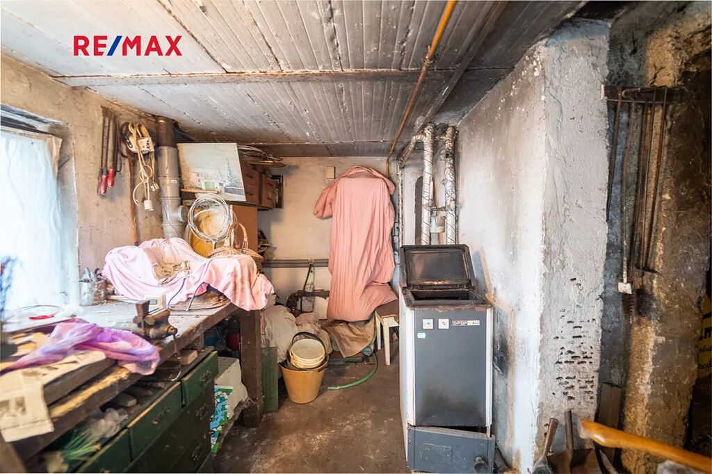 V suterénu je sklípek, dílna a dřevník + technická místnost s původní kotelnou, nyní se již topí plynovým kotlem.