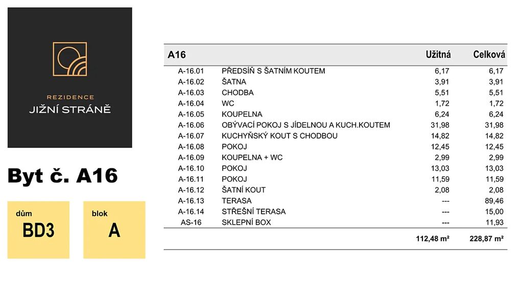 V této druhé etapě vznikne bytový dům BD 3 o dvou blocích A,B propojených suterénním parkovištěm s celkem 36 byty. V rámci této etapy vám nabízíme k prodeji byt 4+kk (označení BD3_A16) s celkovou plochou 213,45 m² (byt 112,06 m², terasa 89,46 m² a sklep 11,93 m²).