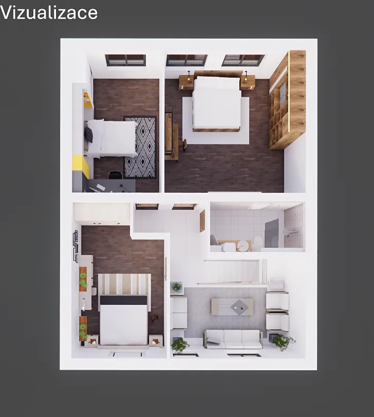Tři samostatné ložnice (hlavní ložnice + 2 dětské / hostinské pokoje)